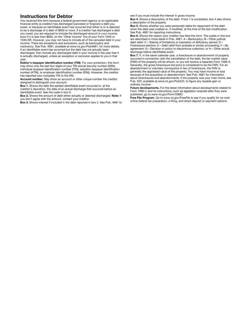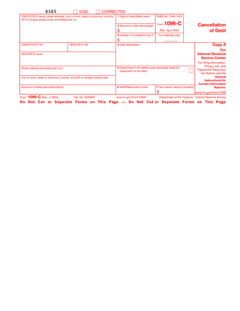 Form 1099-C is used to report the cancellation of a debt of $600 or more that a creditor has forgiven or discharged during the tax year. It includes details about the debtor and creditor, such as names, addresses, taxpayer identification numbers (TINs), the amount of debt canceled, the date of cancellation and the reason the debt was discharged.