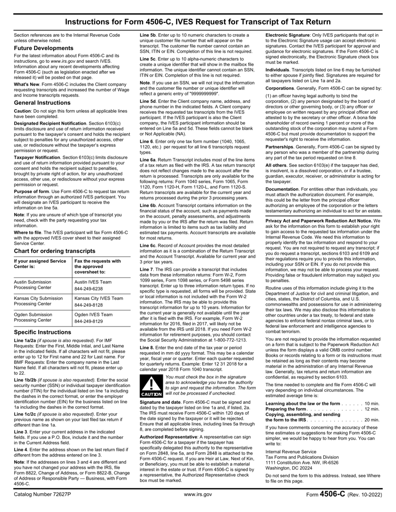 Form 4506-C is the IVES request for transcript of tax return used to authorize an authorized Income Verification Express Service participant such as a lender or other third party to request tax return transcript information directly from the Internal Revenue Service. The form includes the taxpayer’s identifying information the participant’s details the types of transcripts requested and the tax years or periods for which the transcripts are being requested.