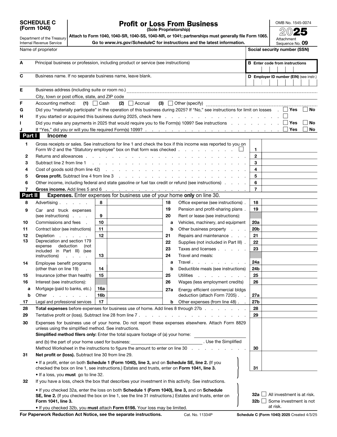 IRS Schedule C (Form 1040) for reporting 2024 sole proprietorship business income, expenses, and net profit or loss.