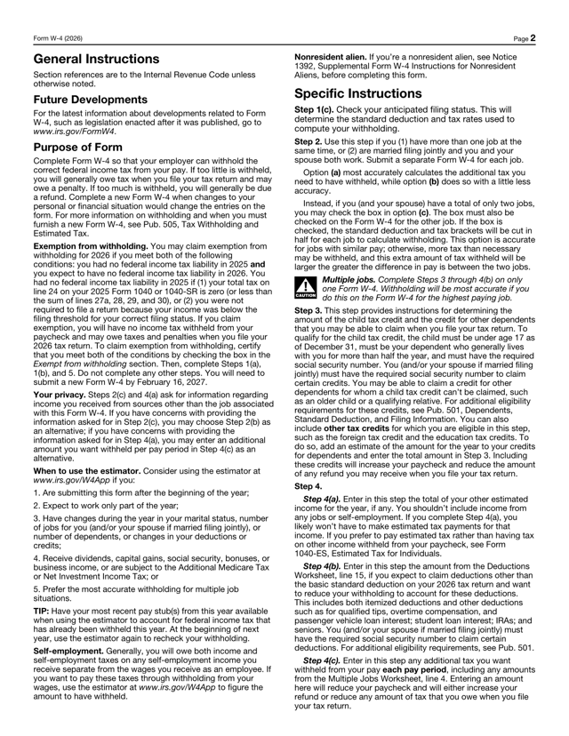 IRS Form W-4 (2026) used by employees to determine federal income tax withholding from wages and to certify any exemption from withholding.