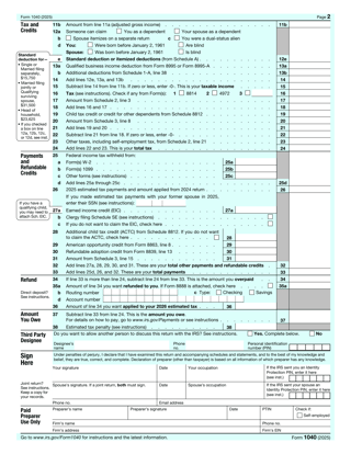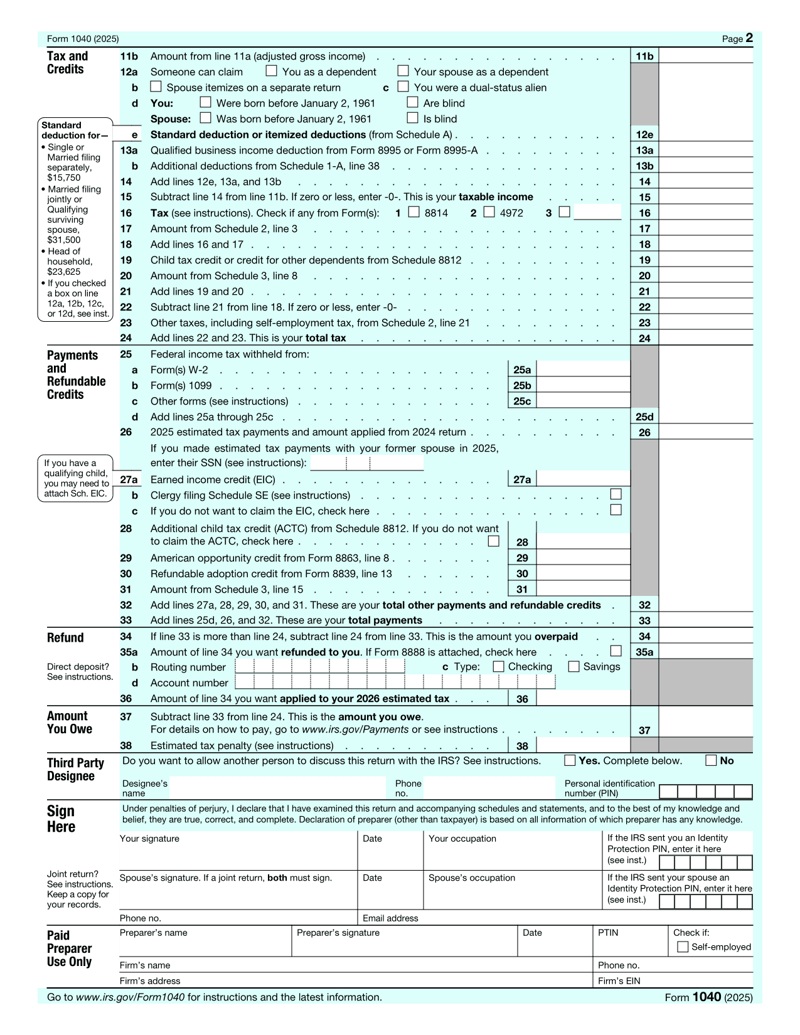 Federal tax return for individuals to report 2024 income, deductions, credits, and payments to calculate refund or amount owed.