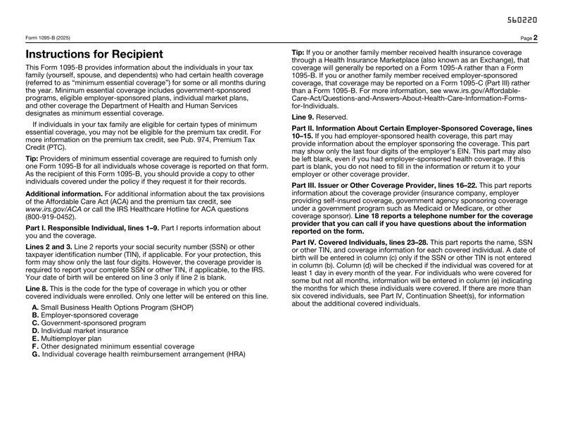 IRS Form 1095-B (2025) reports minimum essential health coverage for a responsible individual and covered family members, including coverage months and issuer details.
