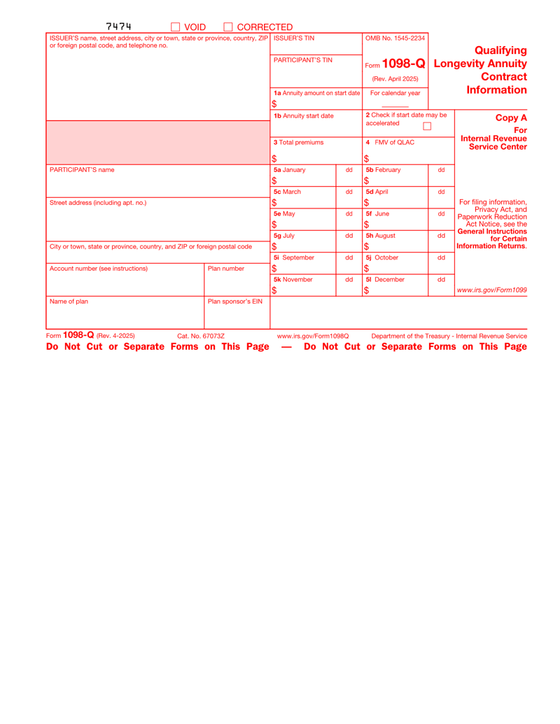 This form is used to report information about qualifying longevity annuity contracts to the IRS, including premiums paid and the fair market value.