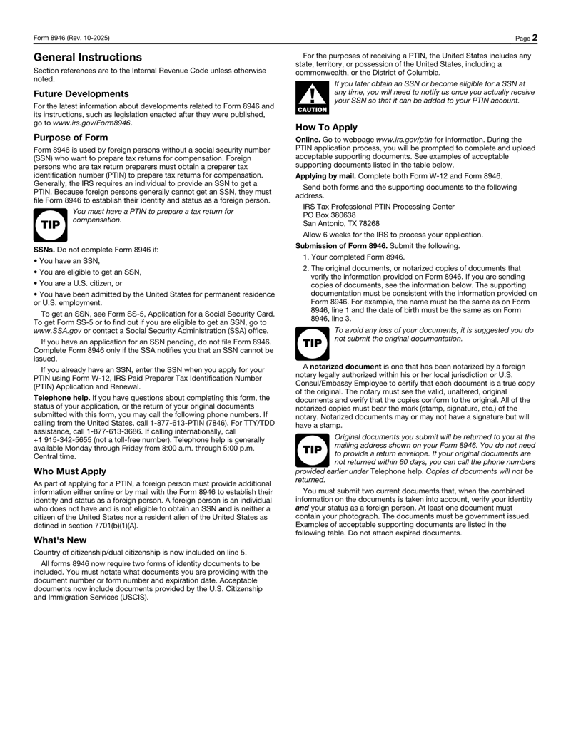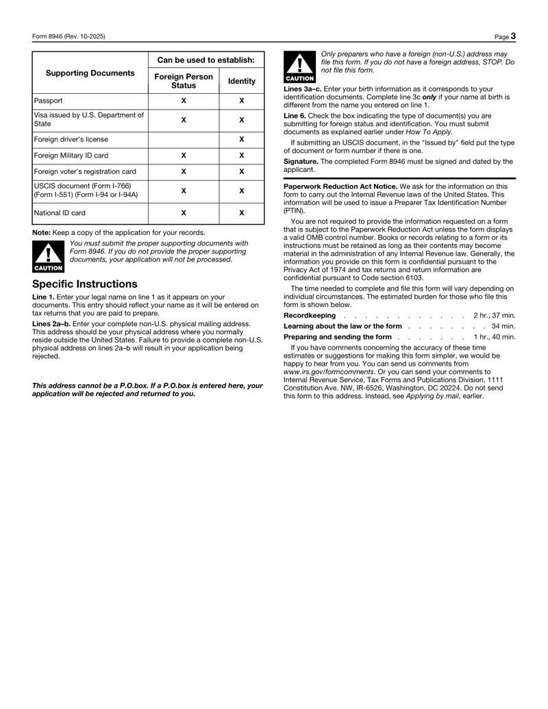 Form 8946 is designed for foreign persons without a social security number (SSN) who wish to prepare tax returns for compensation and need to obtain a preparer tax identification number (PTIN).