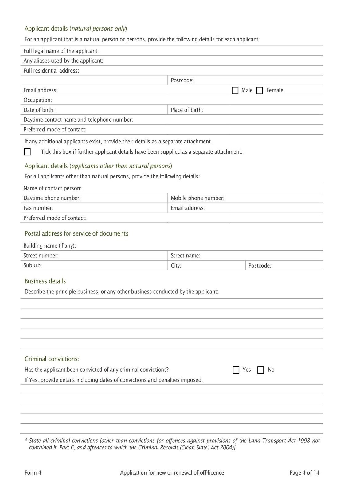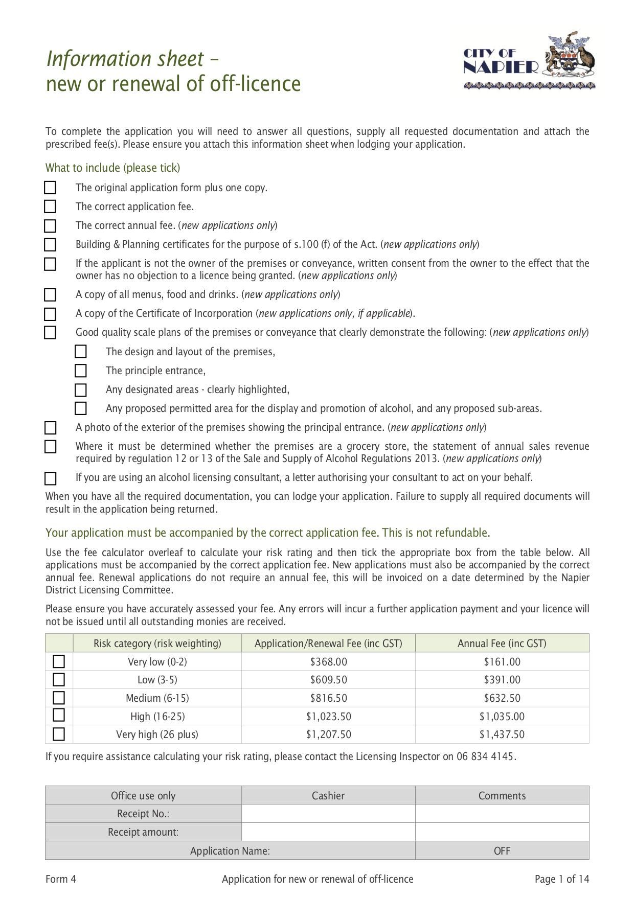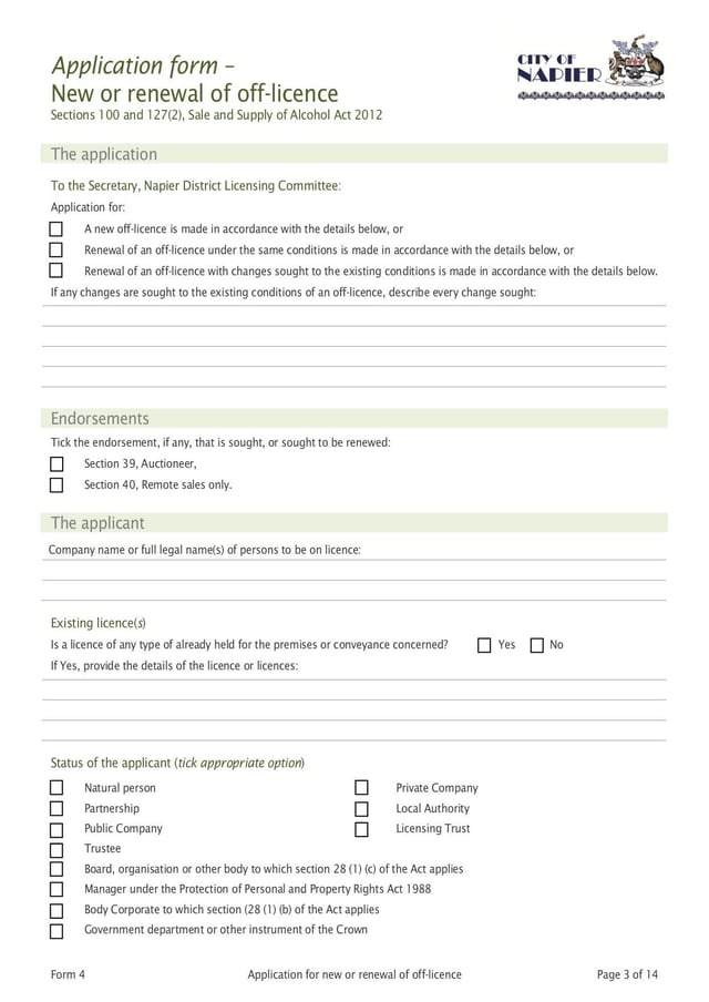 Form 4 Application for new or renewal of off-licence is a form for businesses in the Napier City Council area that want to obtain an off-licence for selling liquor.