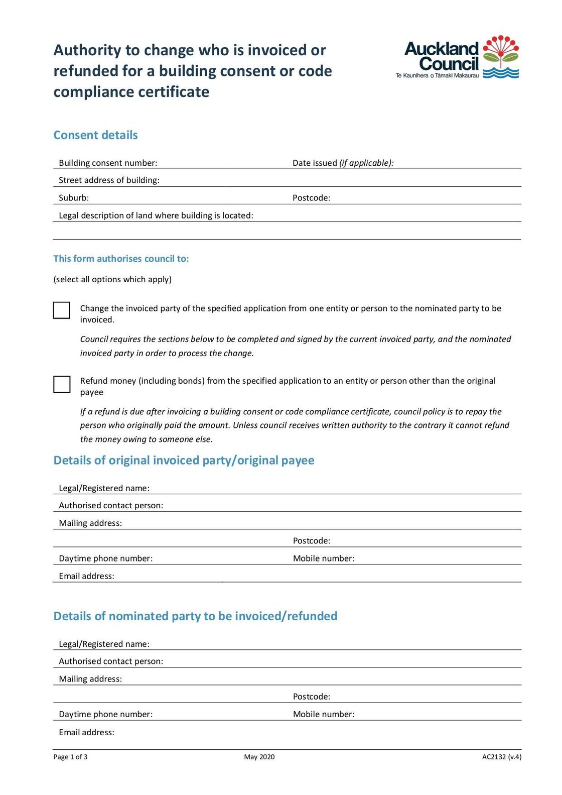 The Form AC2132 Authority to Refund Fees form is used by individuals or organizations to request a refund of fees from Auckland Council.
