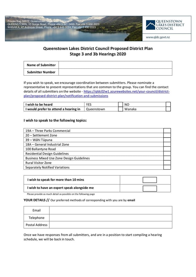 QLDC PDP Hearings Form Stage 3 and 3b is a form issued by the Queenstown Lakes District Council for participants in the PDP (Proposed District Plan) hearings.