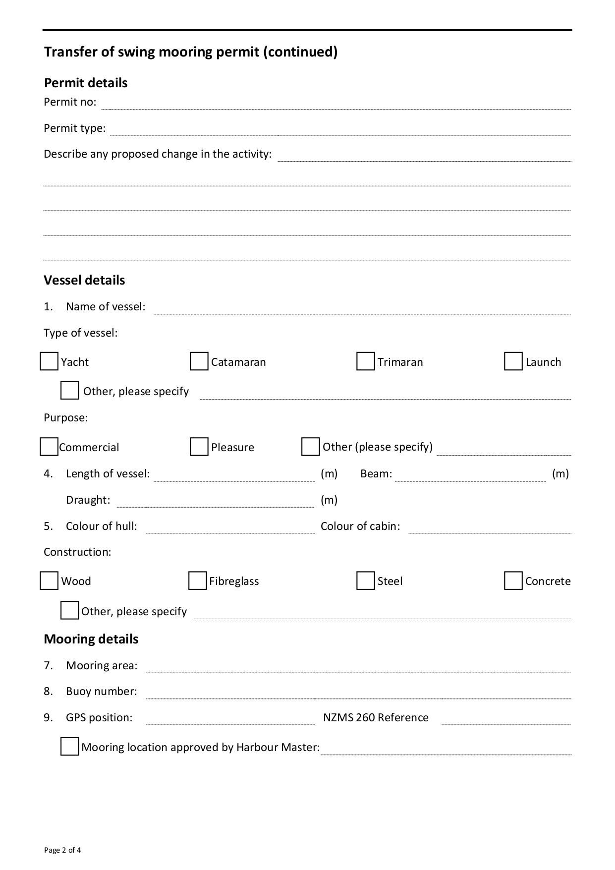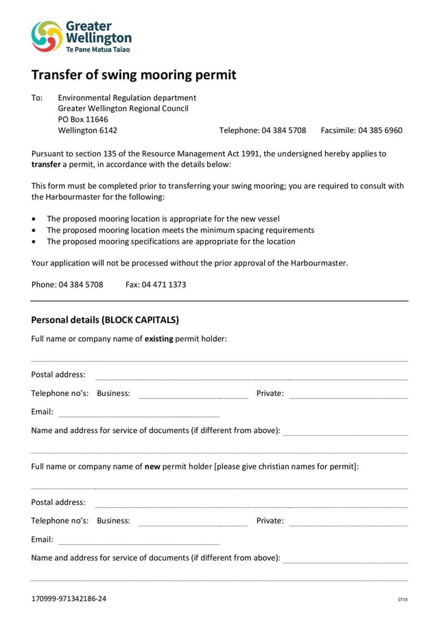 The form is an application GW provides for individuals transferring a permit for a swing mooring.