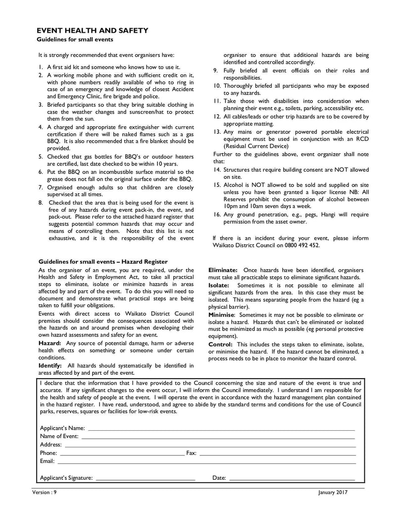 The form provides guidelines and safety measures for organizing events and activities issued by the Waikato District Council.