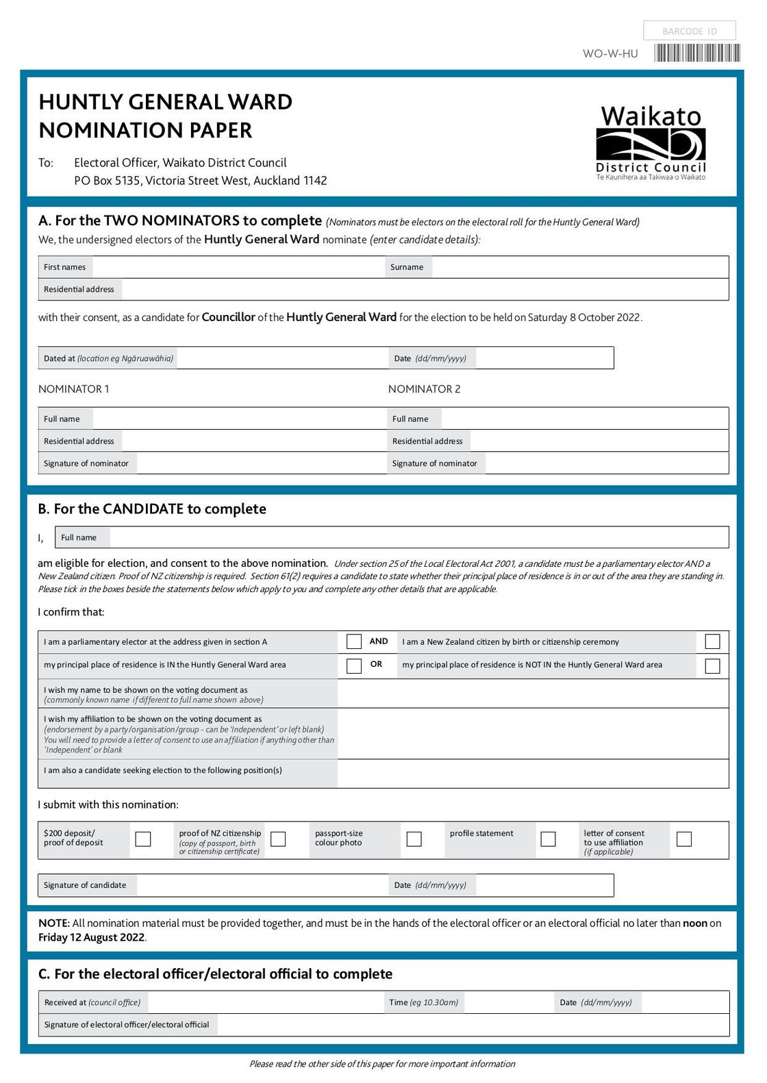 Nomination form for the Huntly General Ward in the 2022 elections.