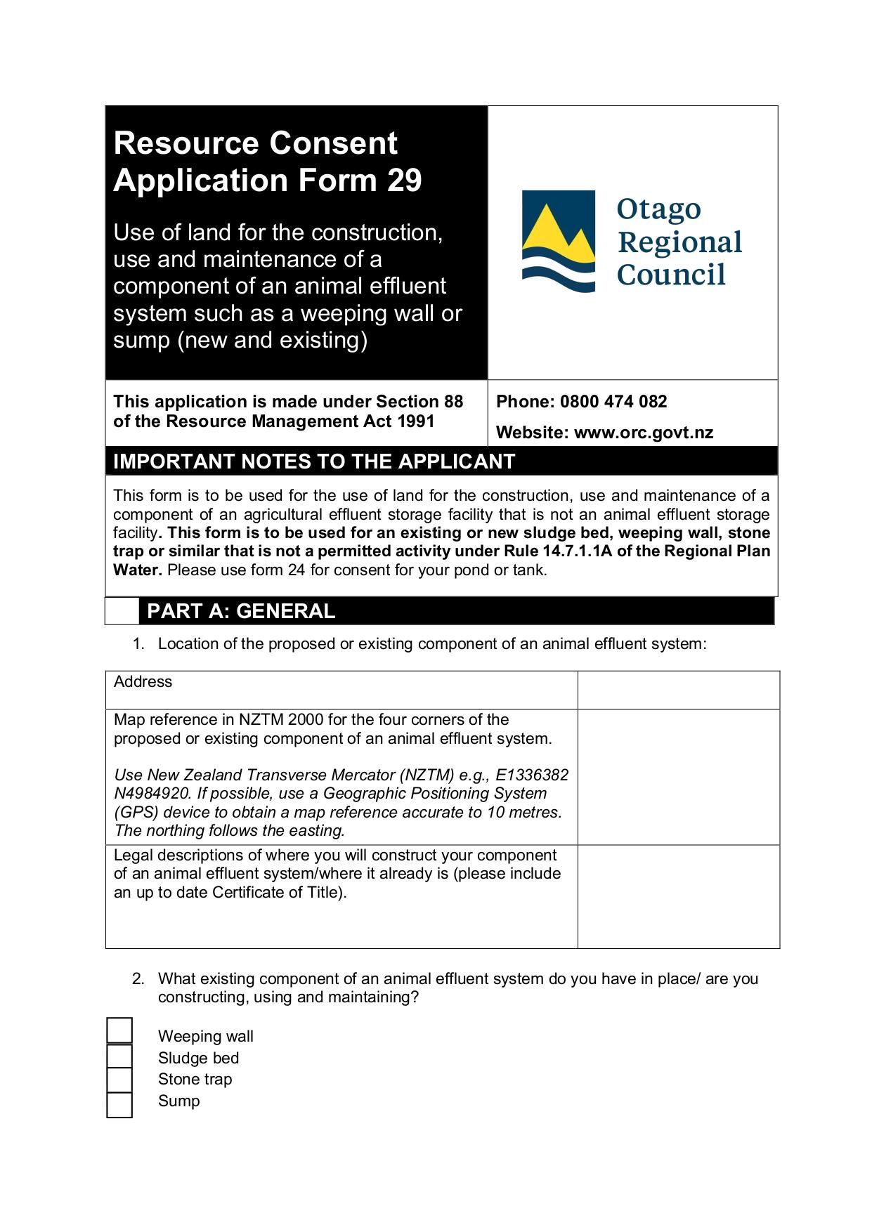 Form 29 is used for applying to use land for the construction and maintenance of an animal effluent system.