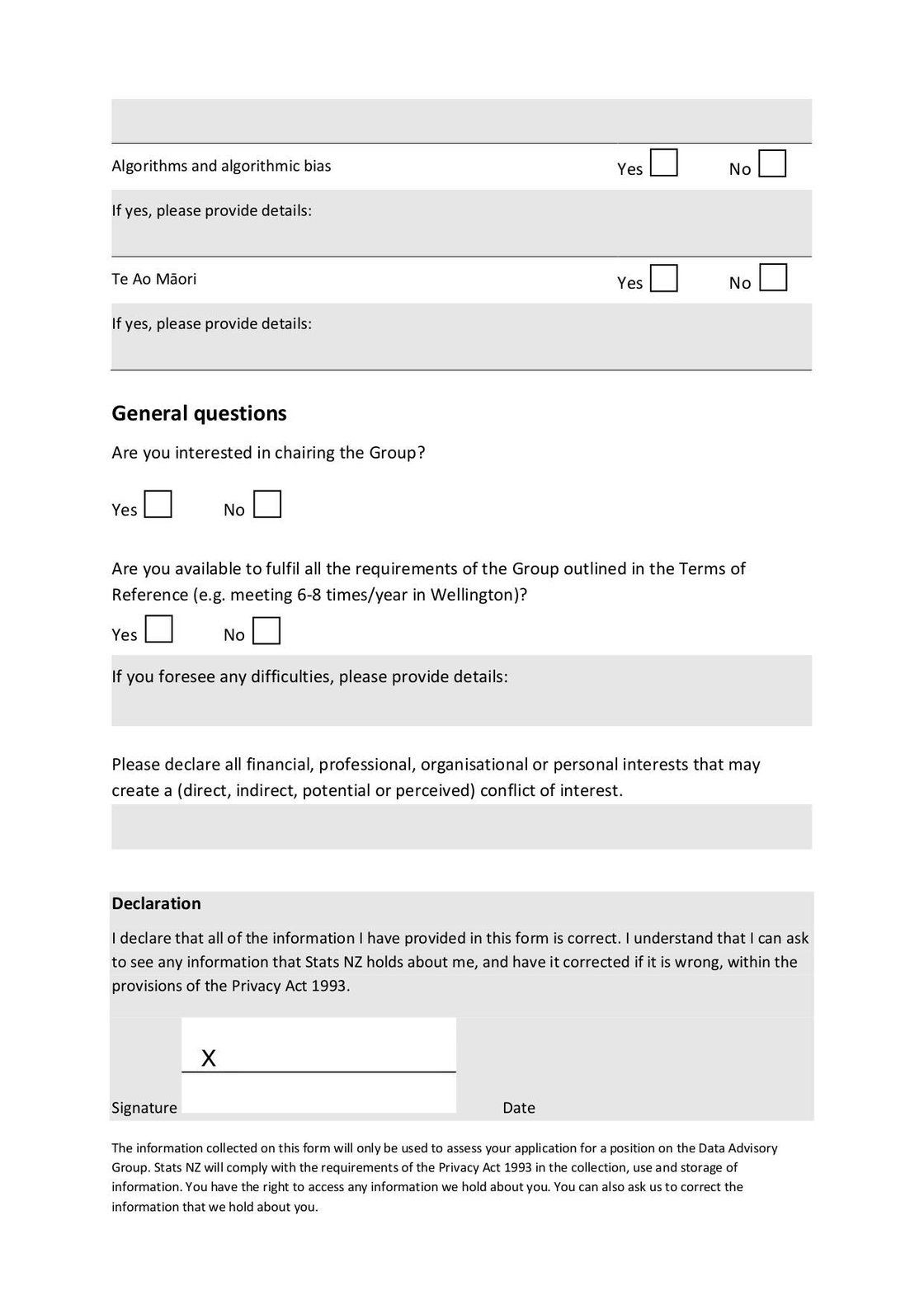 Application form for expressing interest in joining an advisory group, provided by data.govt.nz.