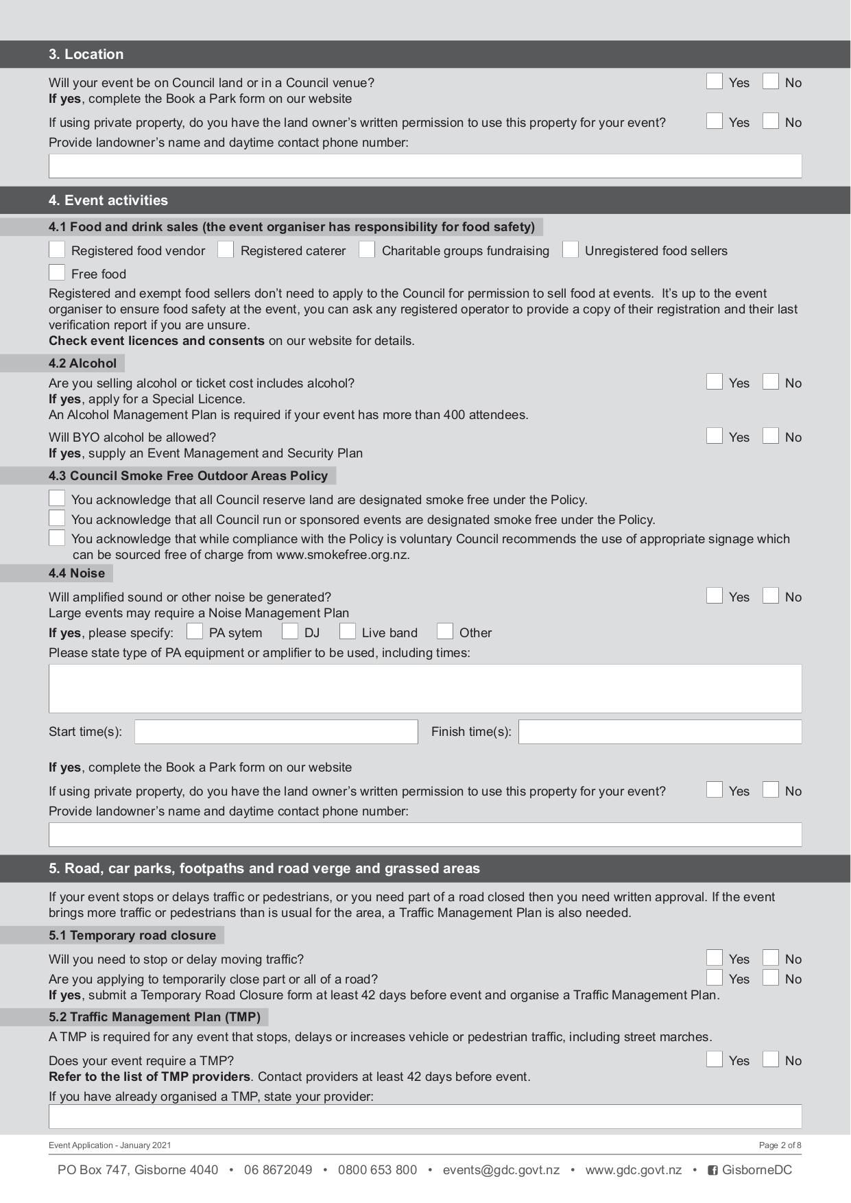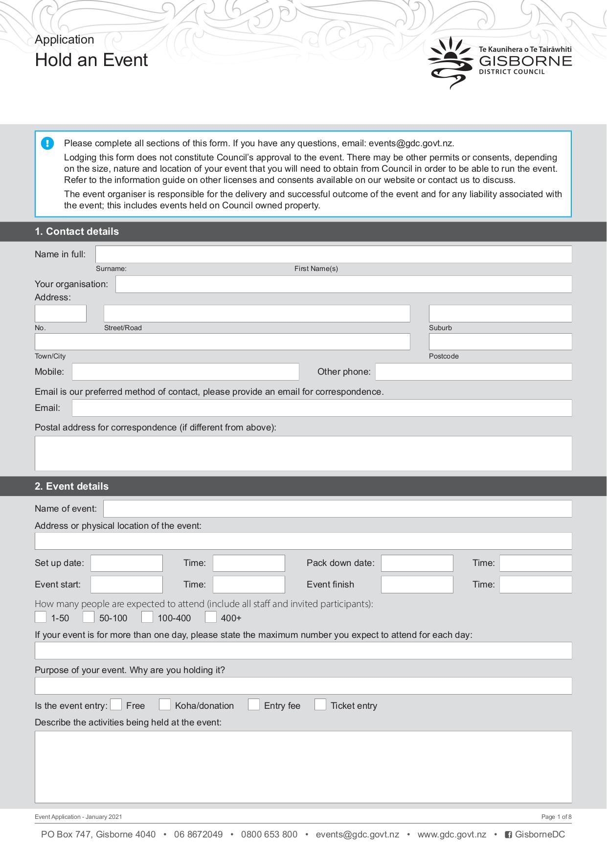 The Application to Hold an Event form is provided by the Gisborne District Council for anyone coordinating an activity in the GDC region.