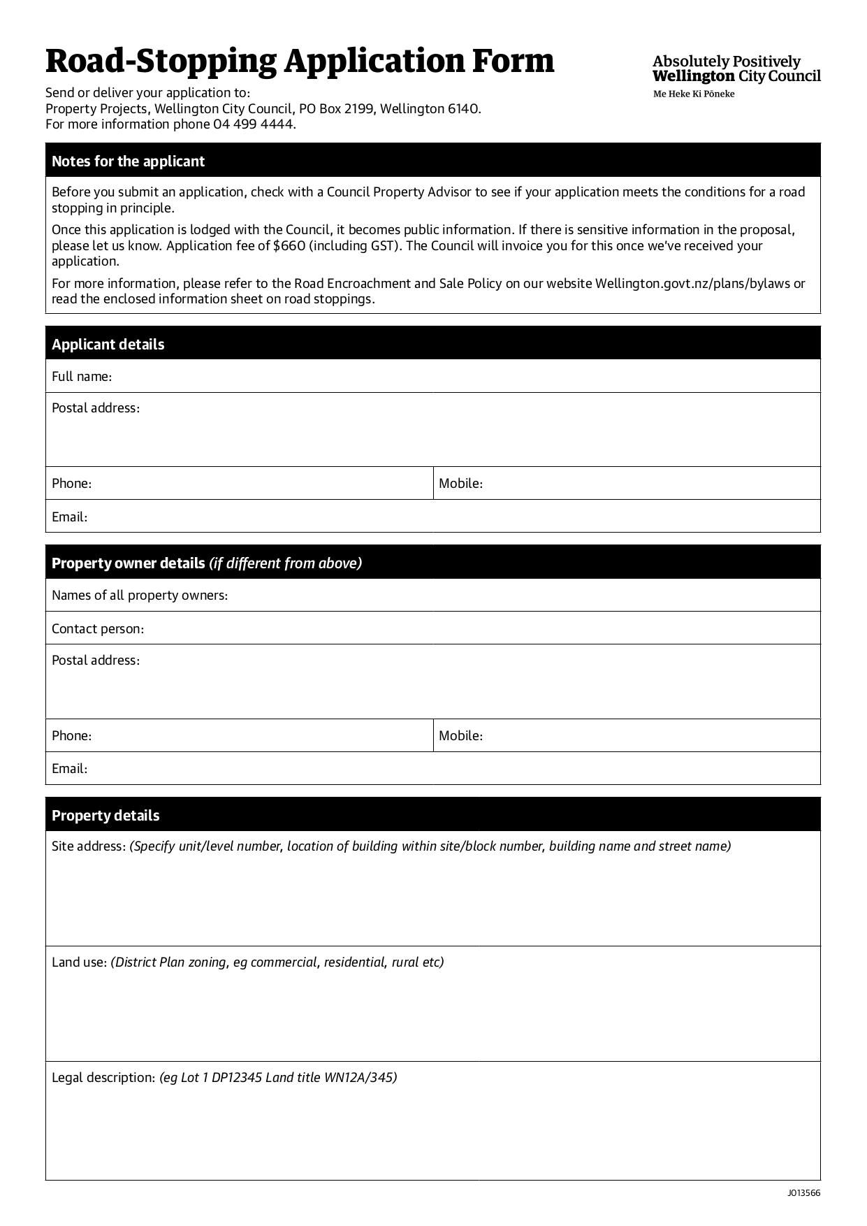 Application form for requesting road stopping in Wellington City.