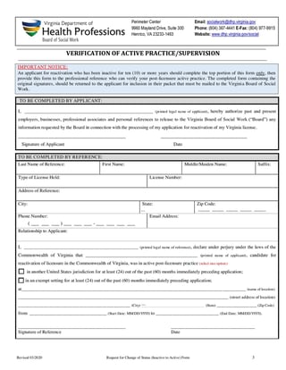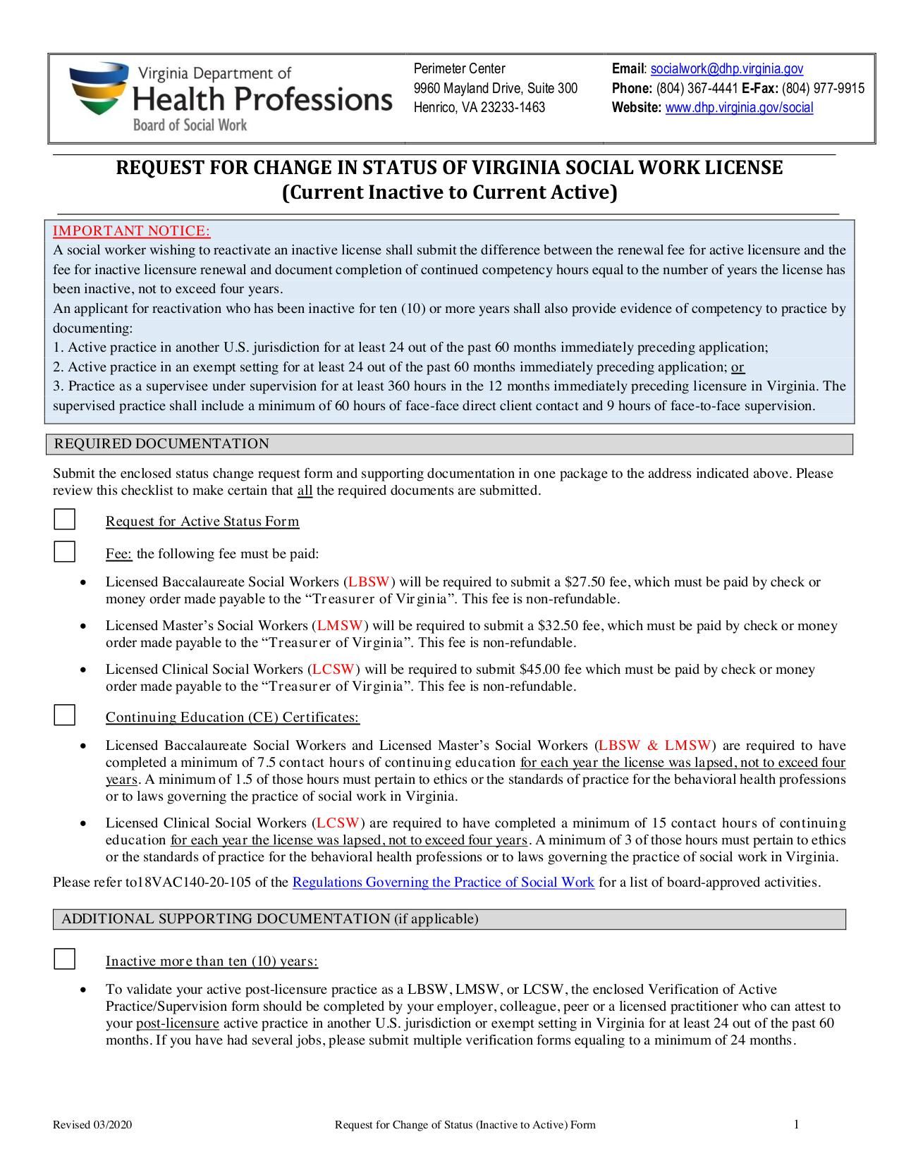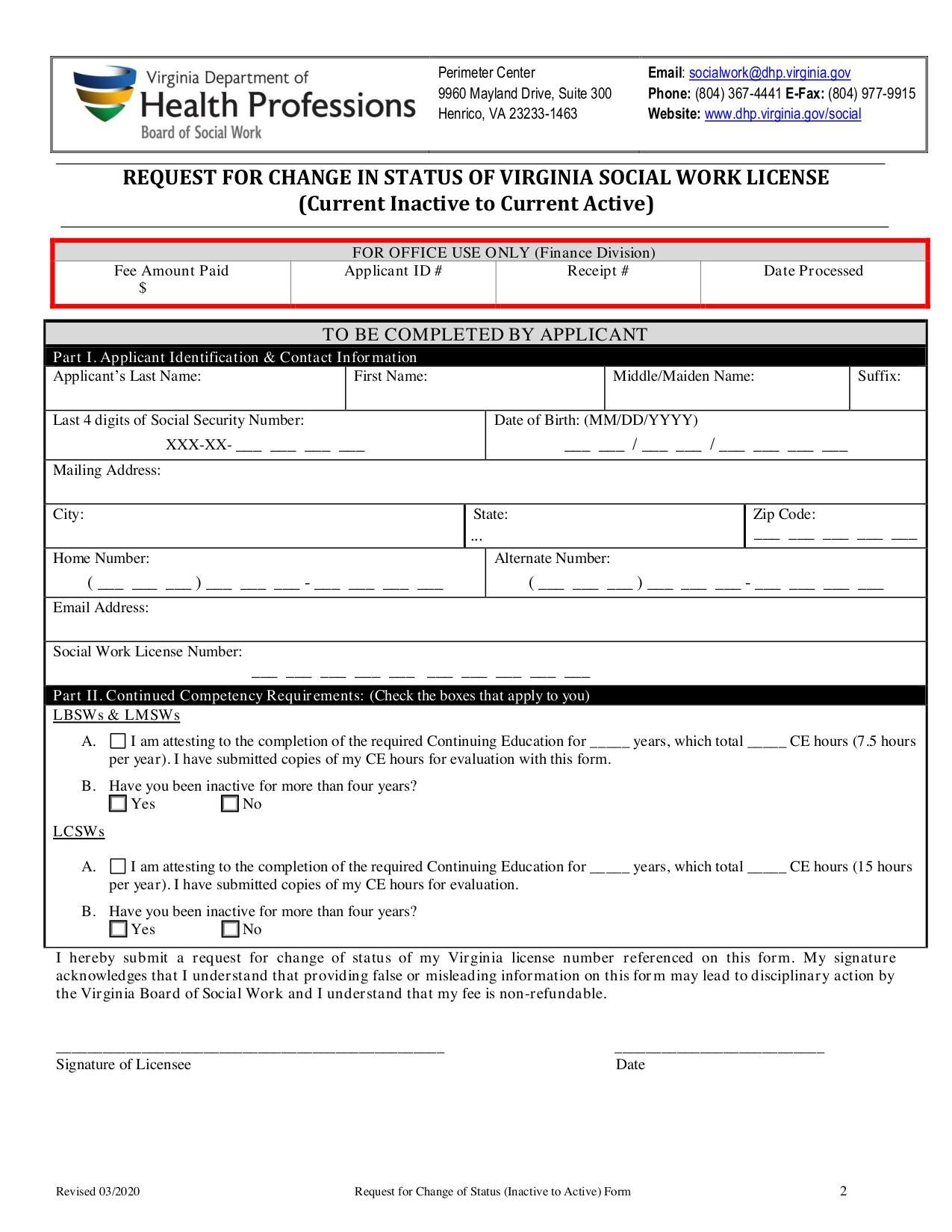 The form is used to request the reactivation of an inactive license or certification with the Virginia Department of Health Professions.