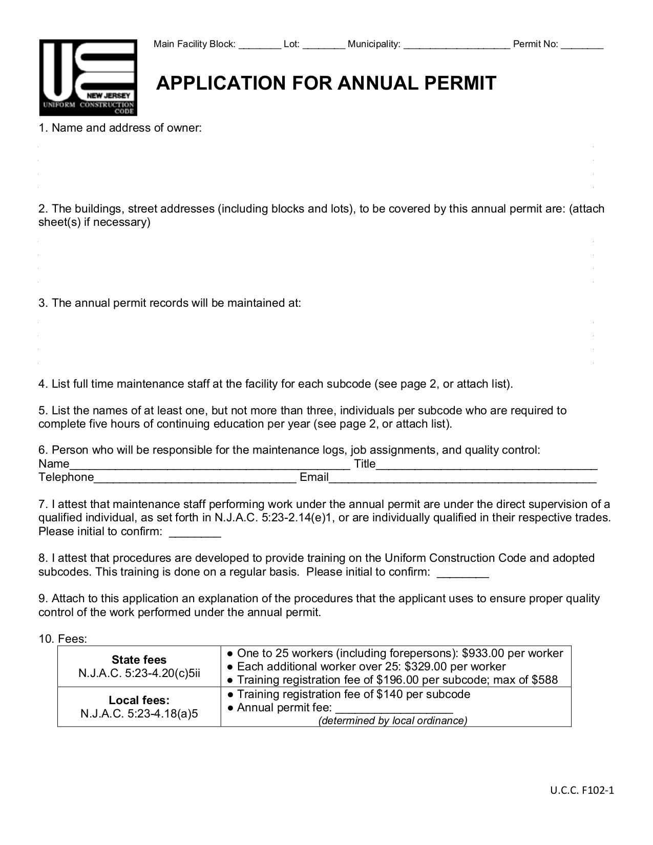 The form is used to apply for an annual permit under the New Jersey Uniform Construction Code.