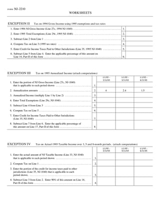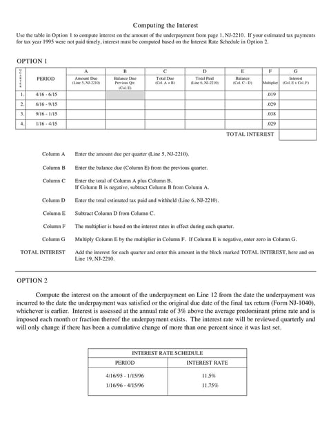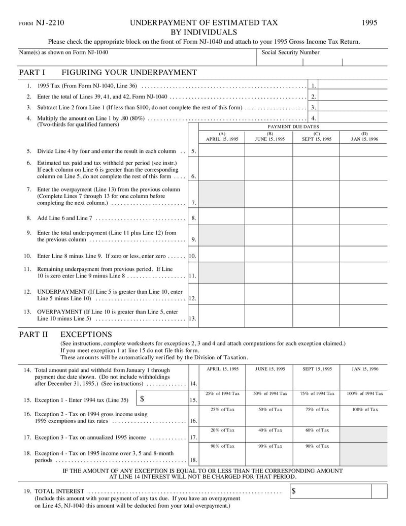 Form NJ-2210 is used by taxpayers who expect to owe more than $400 in NJ Gross Income Tax and want to declare and pay estimated tax.
