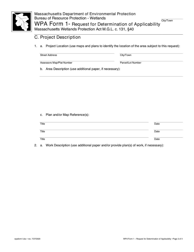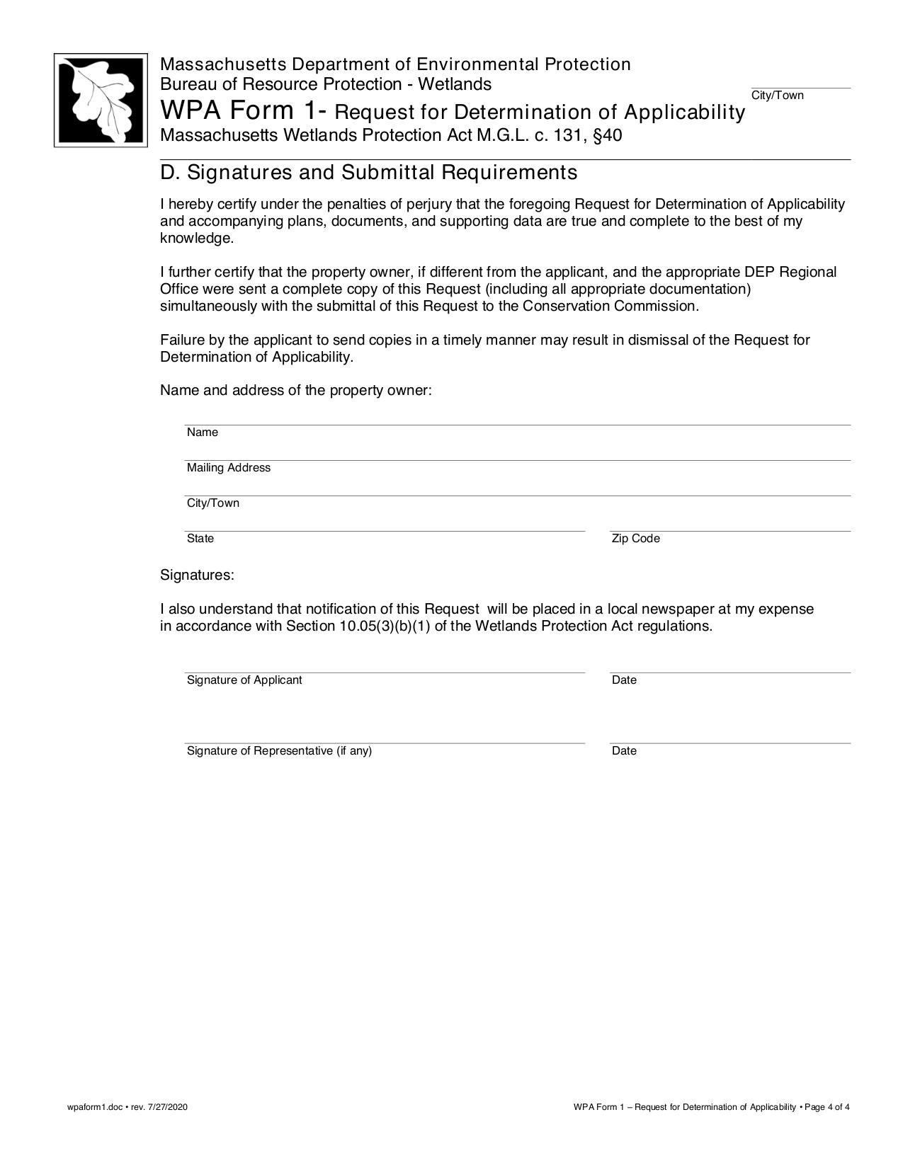The form is used to request a determination of applicability under the Massachusetts Wetlands Protection Act (WPA).