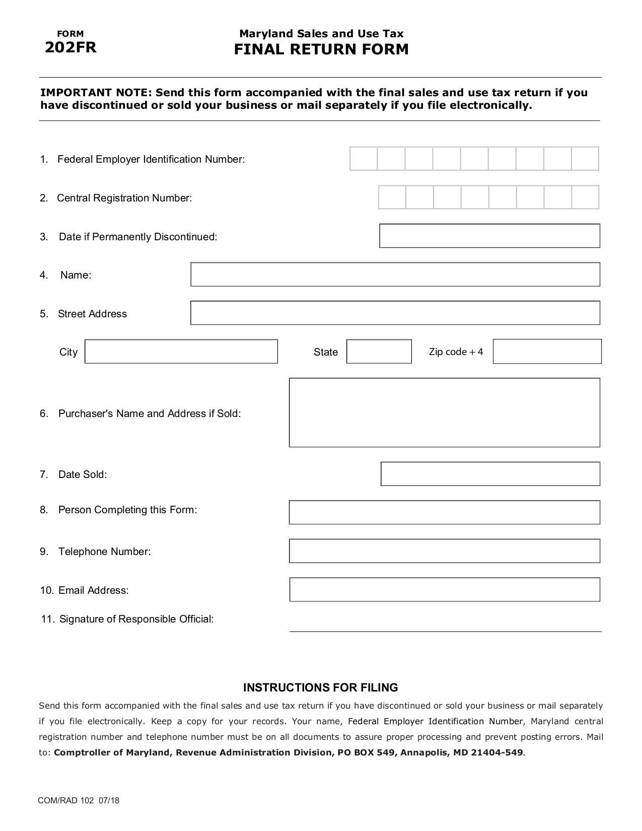 The Maryland Form 202FR is used by businesses operating in Maryland to report their sales and use tax.