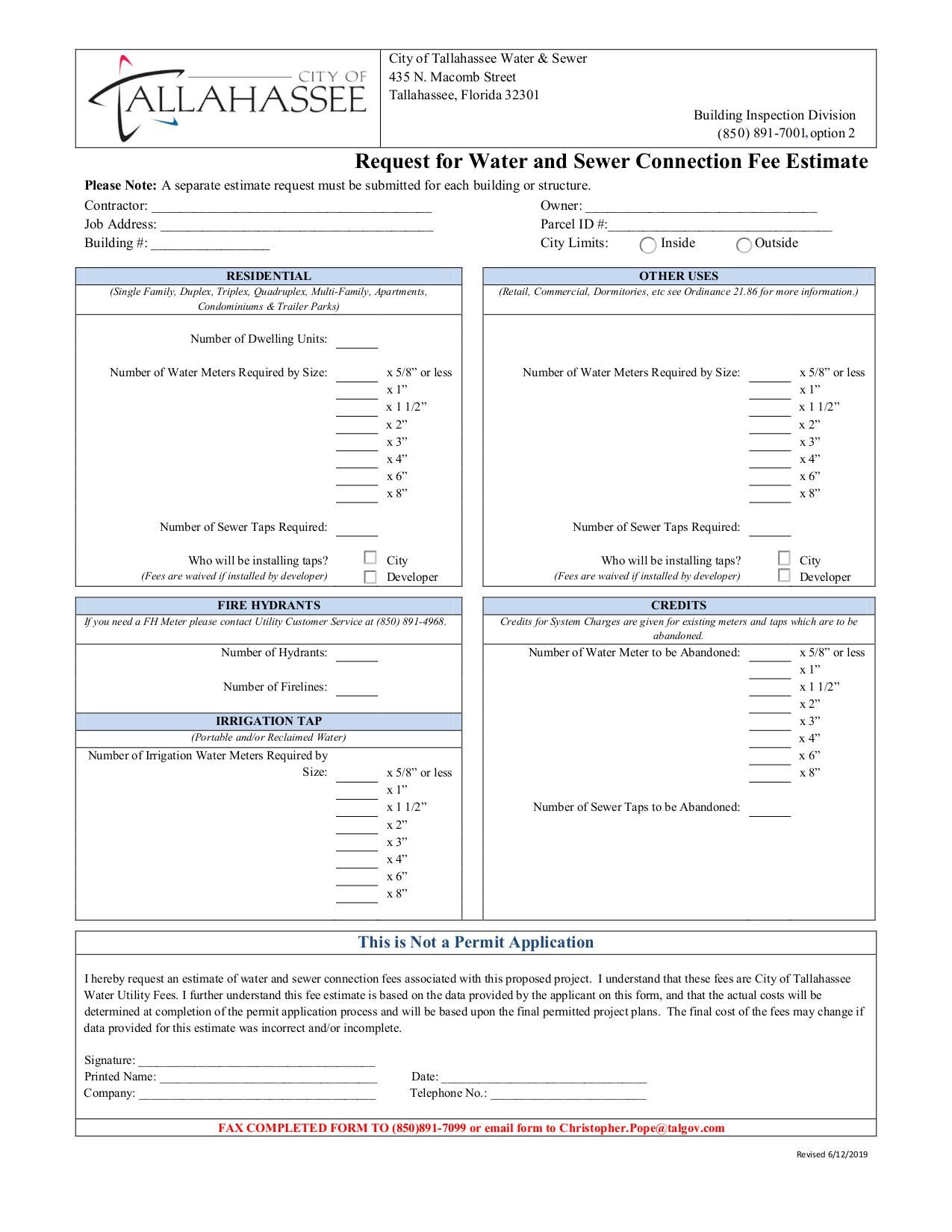 The form is used by individuals or organizations to request estimates for water and sewer services.