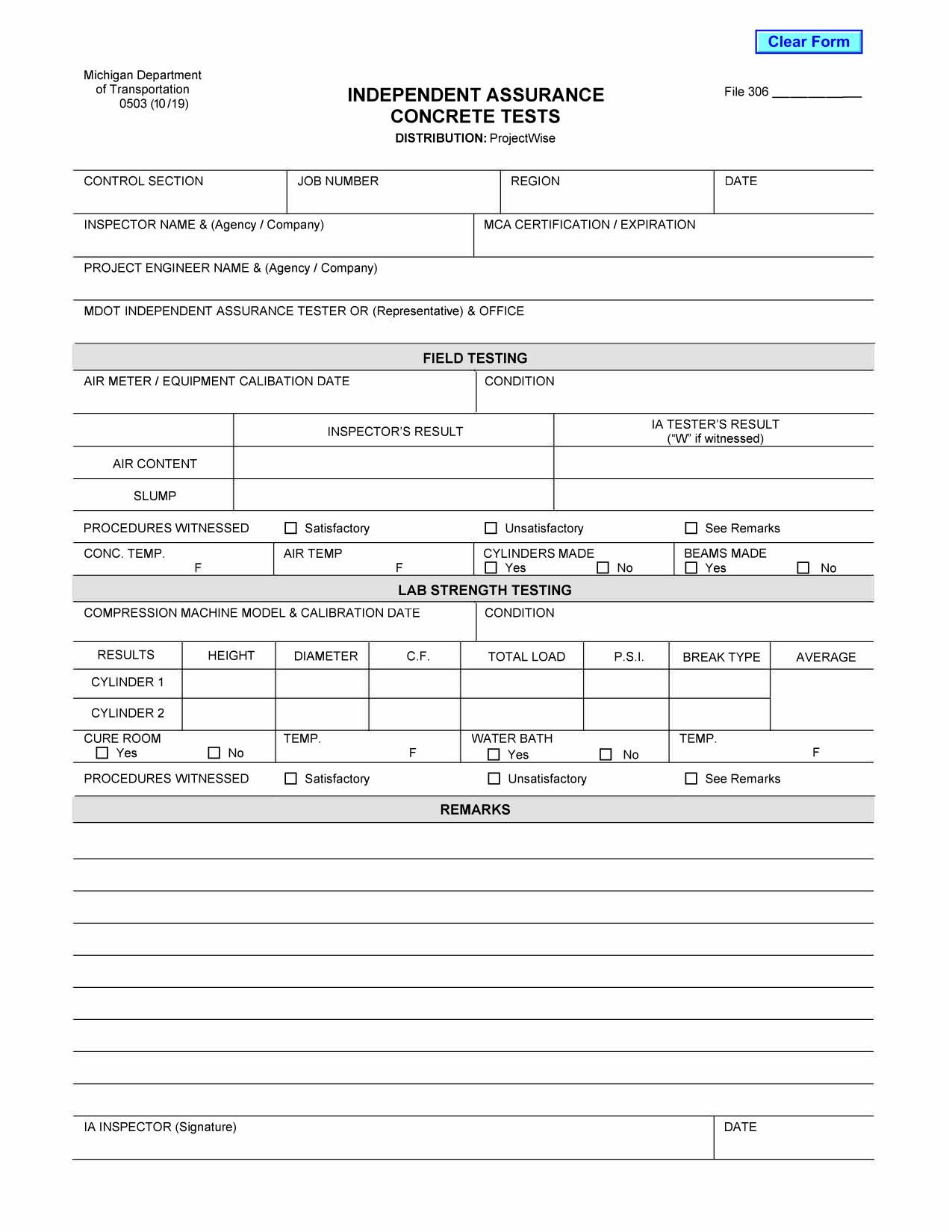 The Form 0503 is used by inspectors, testers, and representatives involved in concrete testing for Michigan Department of Transportation projects.