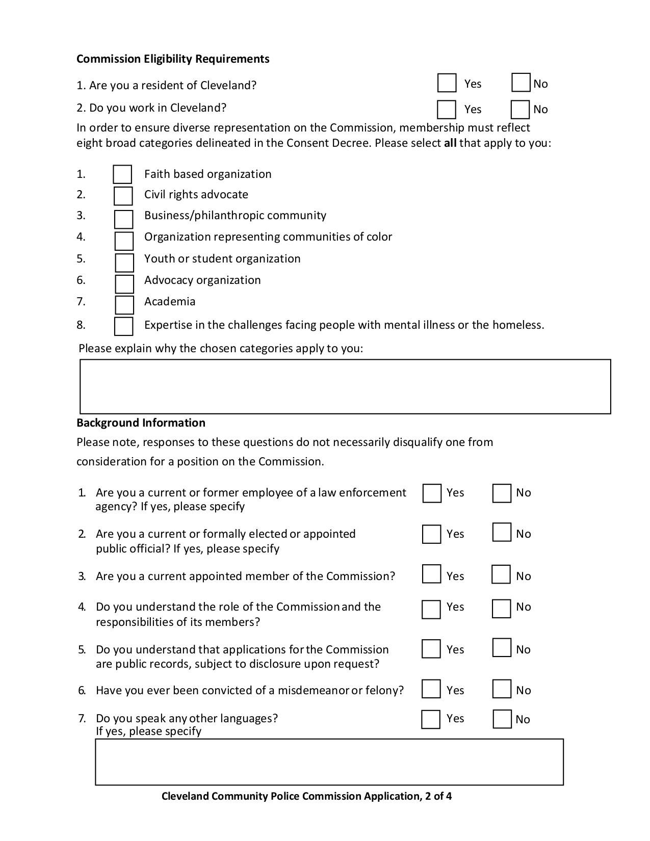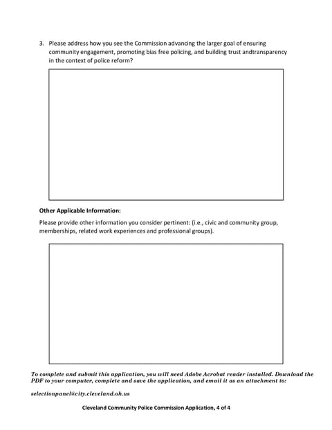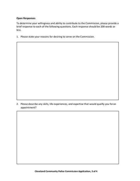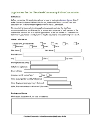 These Cleveland CPC Application Form and Instructions are used by individuals who are interested in applying to serve on the Cleveland Community Police Commission. It collects personal and contact information from the applicant.