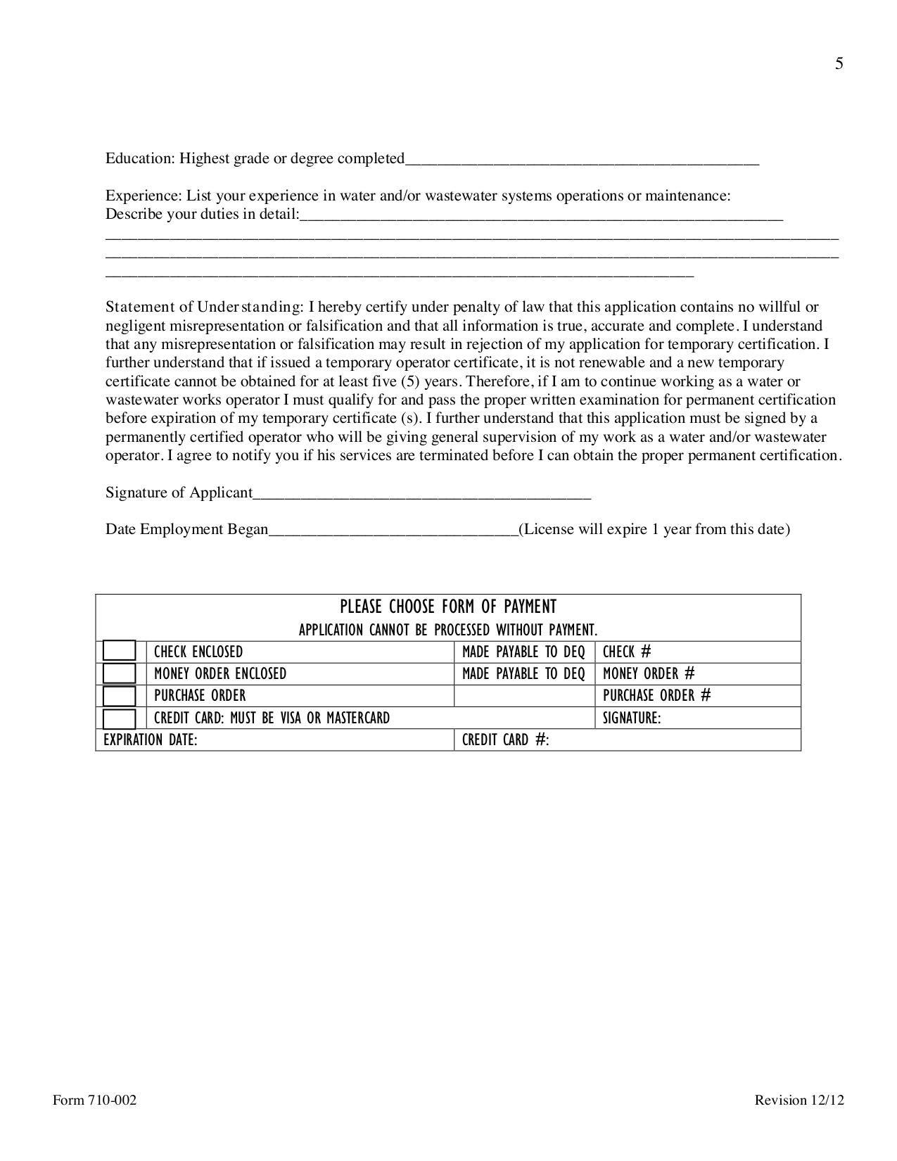 Form 710-002 is an application for temporary certification to operate a water or wastewater facility in Oklahoma.