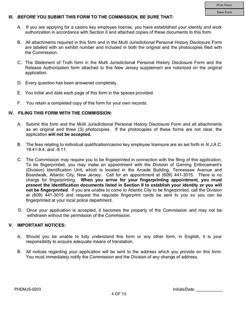 New Jersey Supplemental Form and Multi Jurisdictional Personal History Disclosure Form.