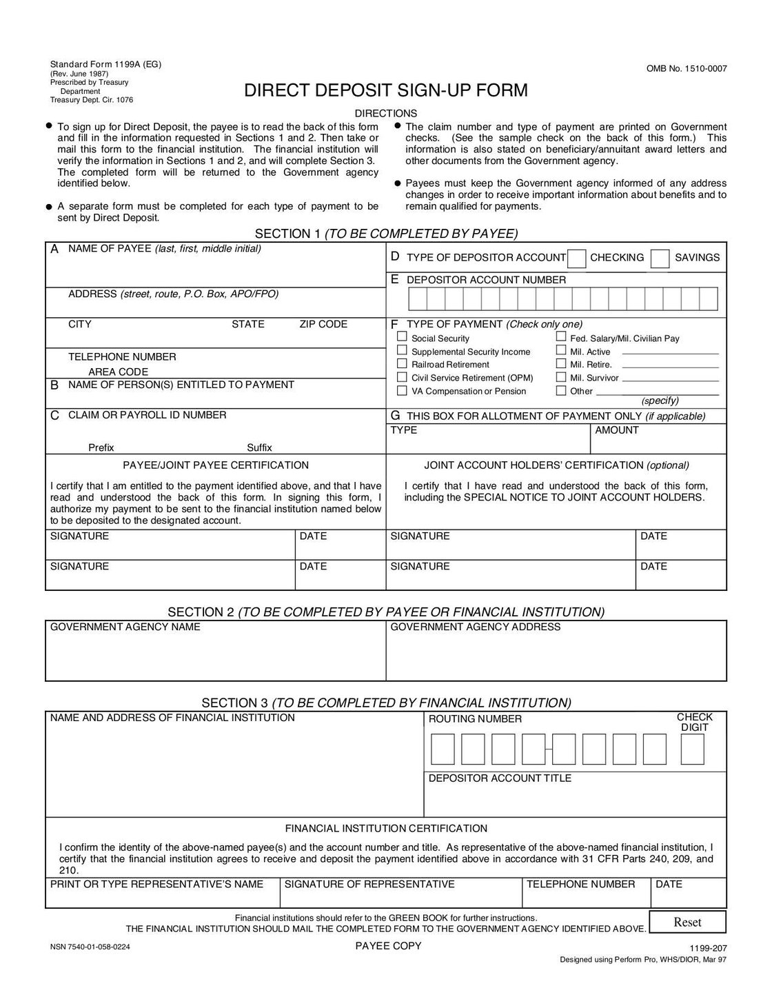 Direct Deposit Sign-Up Form issued by the Department of Military and Naval Affairs of New York State.