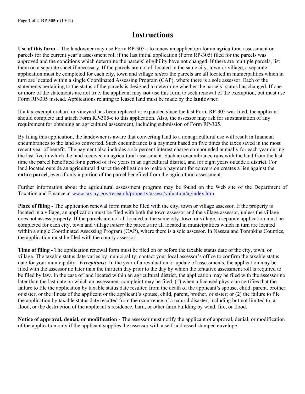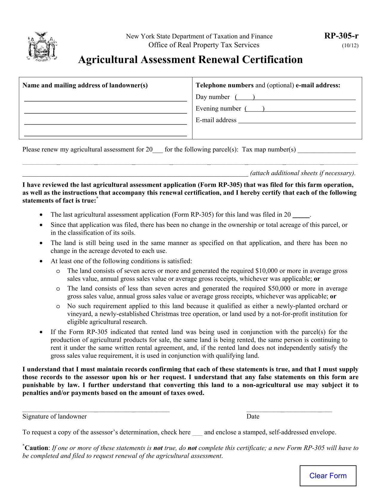 The Form RP-305-r is used by landowners in New York State to renew their agricultural assessment certification.