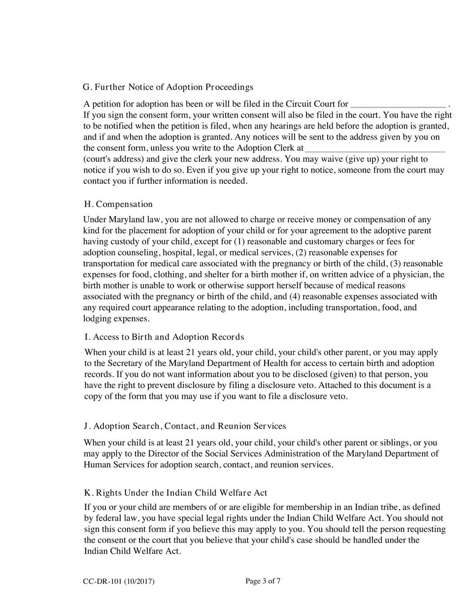 The Form CC-DR-101 is a form used by parents whose parental rights are being terminated in an independent adoption.