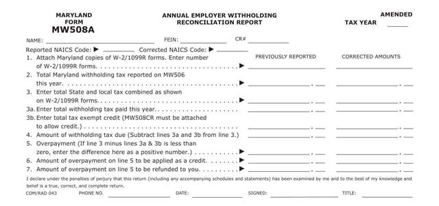 The Form MW508A is used to correct previously reported amounts of W2/1099R forms.