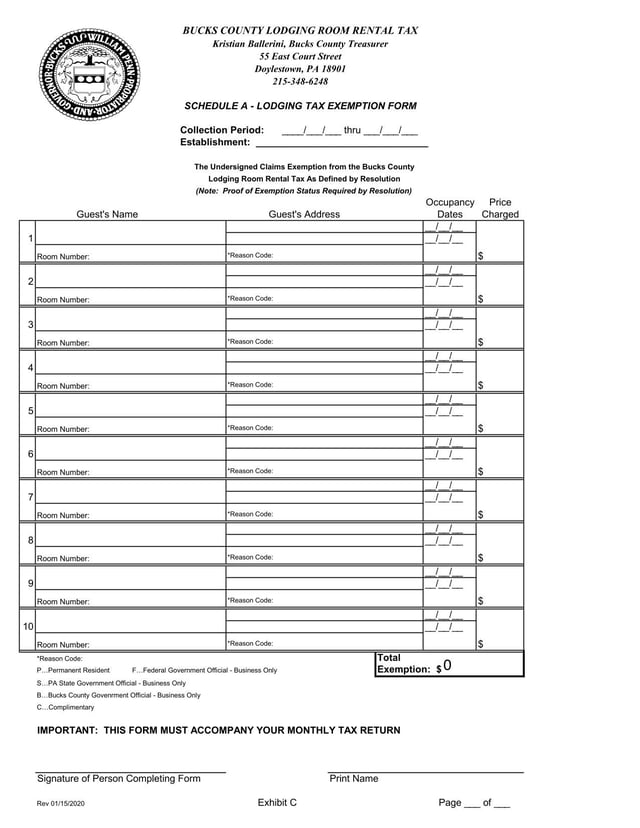 - Bucks County Schedule A-Lodging Tax Exemption Form