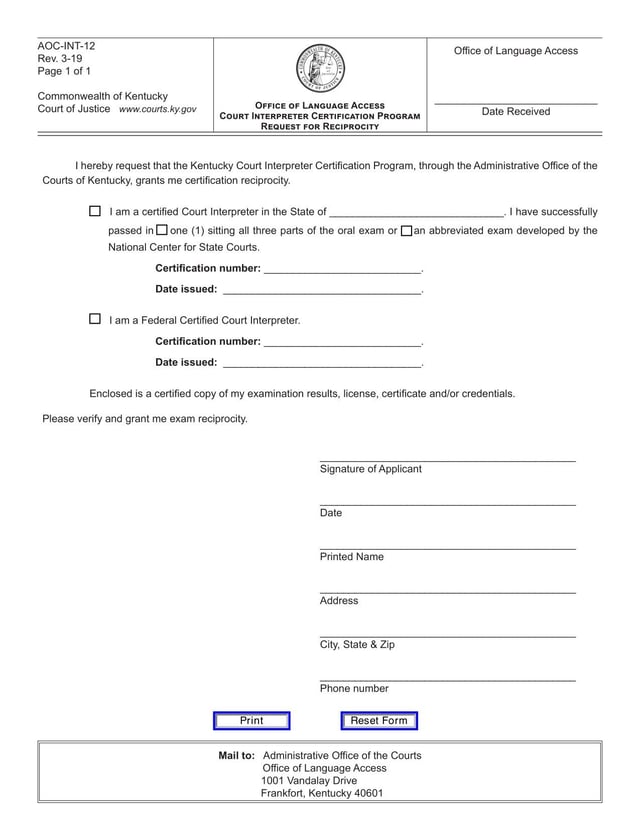 The Form AOC-INT-12 is used by certified court interpreters to request certification reciprocity in the Kentucky Court Interpreter Certification Program.