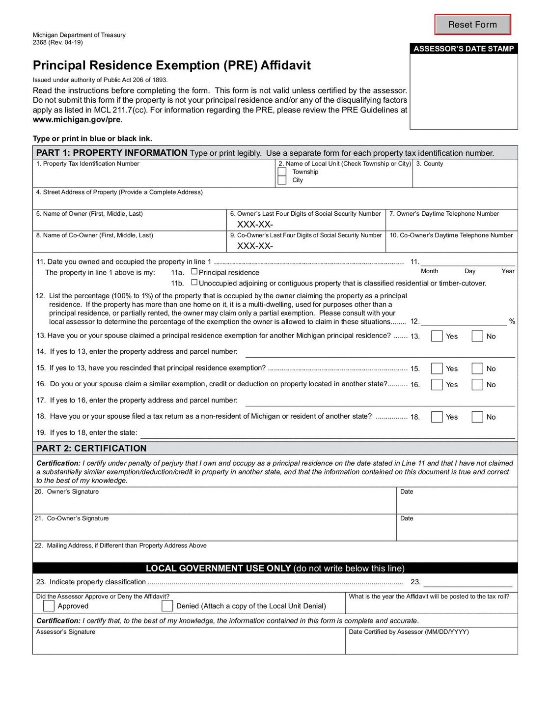 Form 2386 PRE exempts a principal residence from the tax levied by a local school district for school operating purposes.