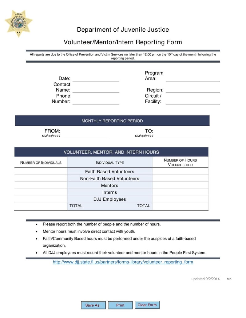 The Florida Volunteer/Mentor/Intern Reporting Form is used by volunteers, mentors and interns with the Department of Juvenile Justice to report their activities.