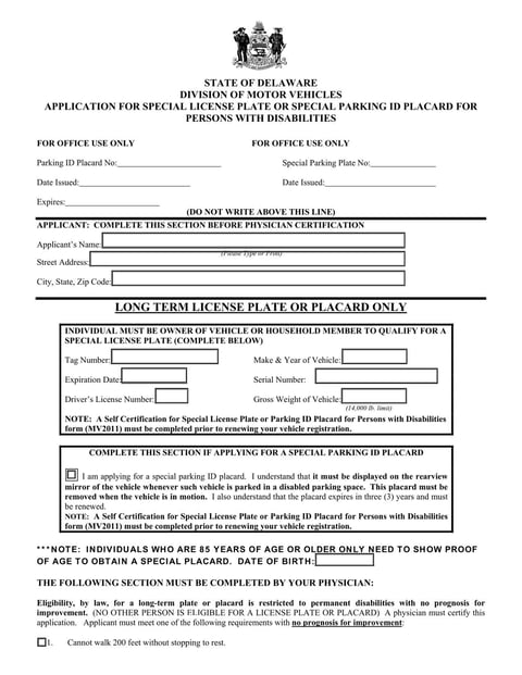 The Form MV474 is used to apply for a special license plate or special parking ID placard for persons with disabilities in the state of Delaware.