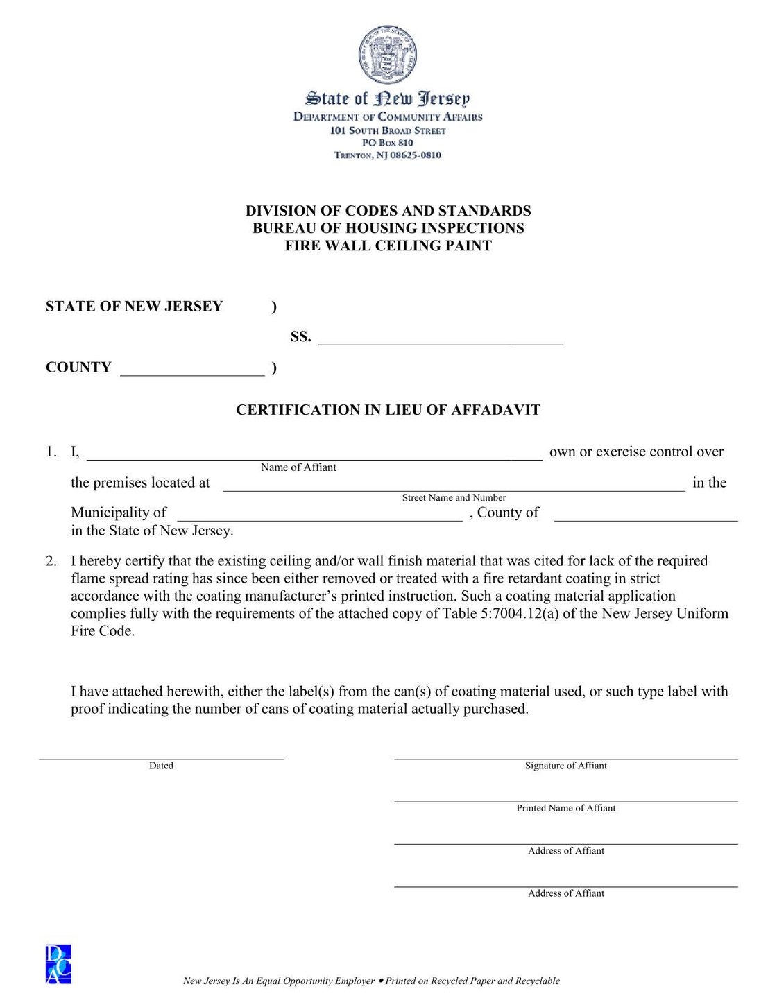 The New Jersey Certification in Lieu of Affadavit is a certification form for property owners or individuals exercising control over premises in New Jersey. This form is used to certify that the existing ceiling and/or wall finish material, previously cited for lack of the required flame spread rating, has been either removed or treated with a fire retardant coating as per the coating manufacturer's instructions.