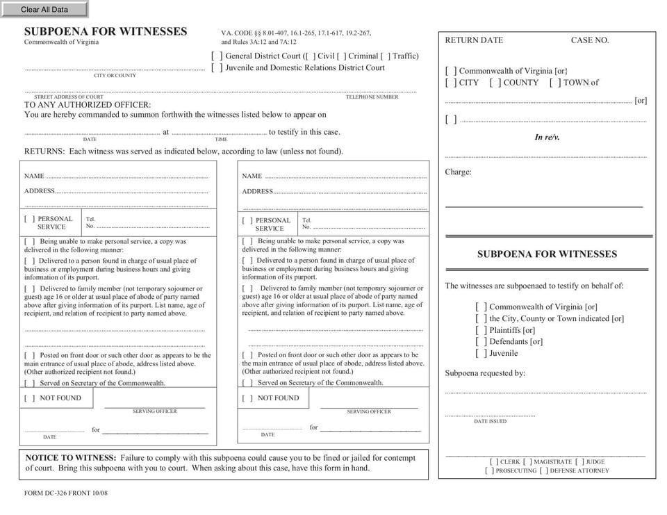 This form is a civil summons used in Virginia district courts. The summons informs the defendant of the lawsuit and the date and time of the court hearing.