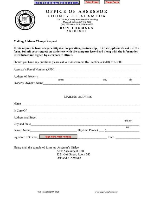 The form is used to request mailing services from the Alameda County Assessor's Office.