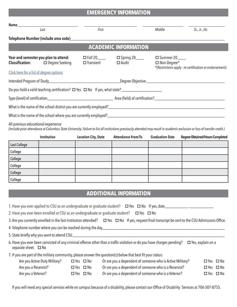 The Columbus State University Graduate Admission Application form is used by students to apply for graduate admission at university.
