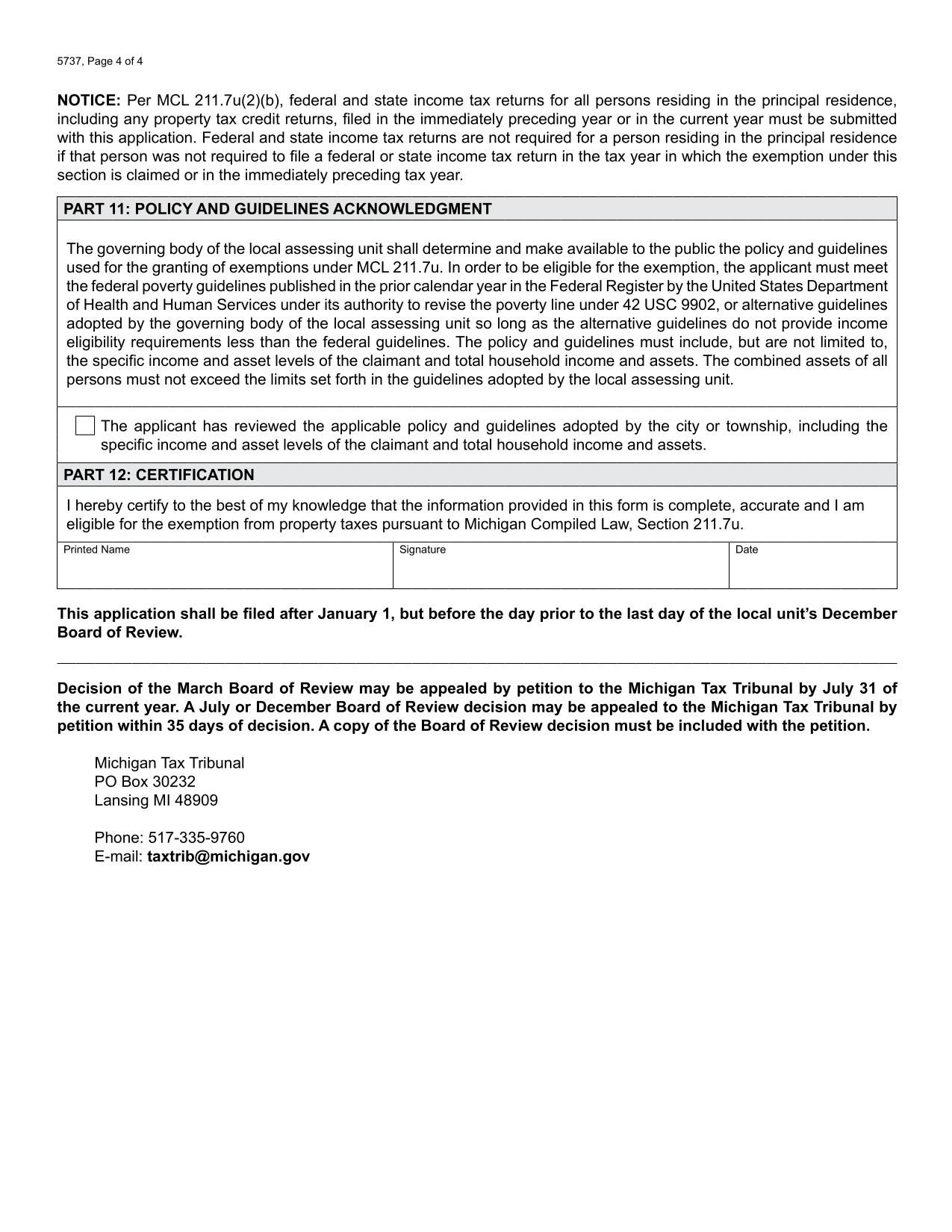 The Form 5737 is used by property owners in Michigan who are seeking a poverty exemption from property taxes.