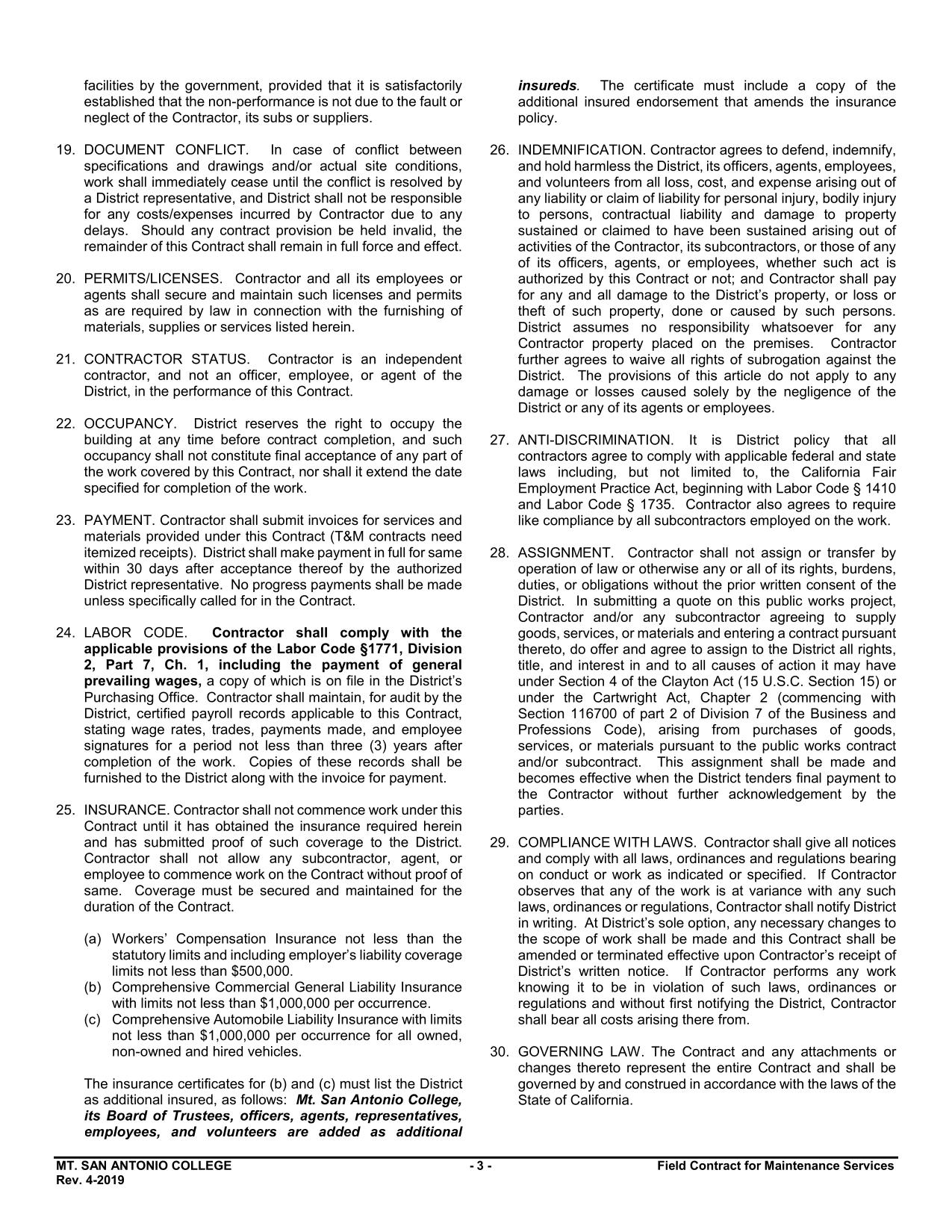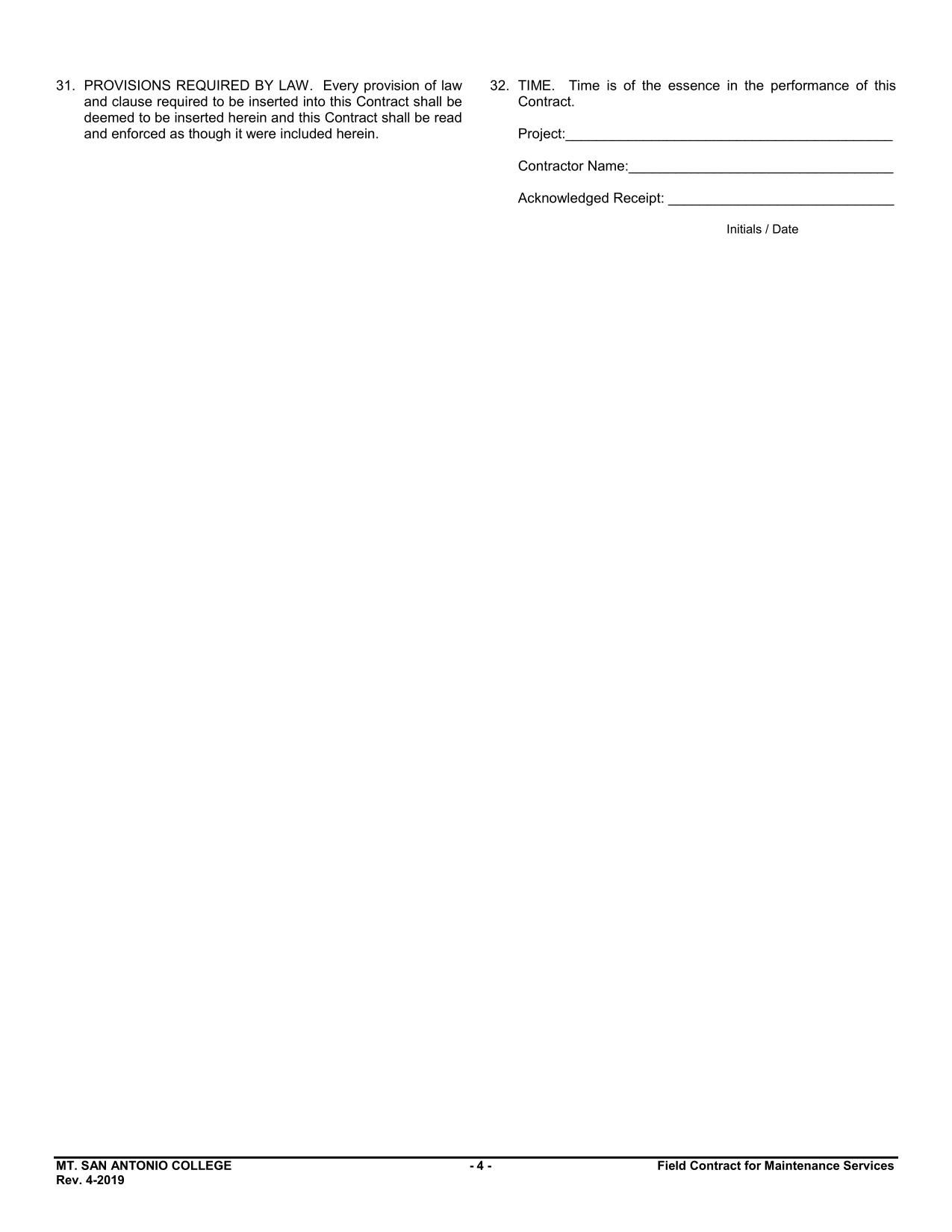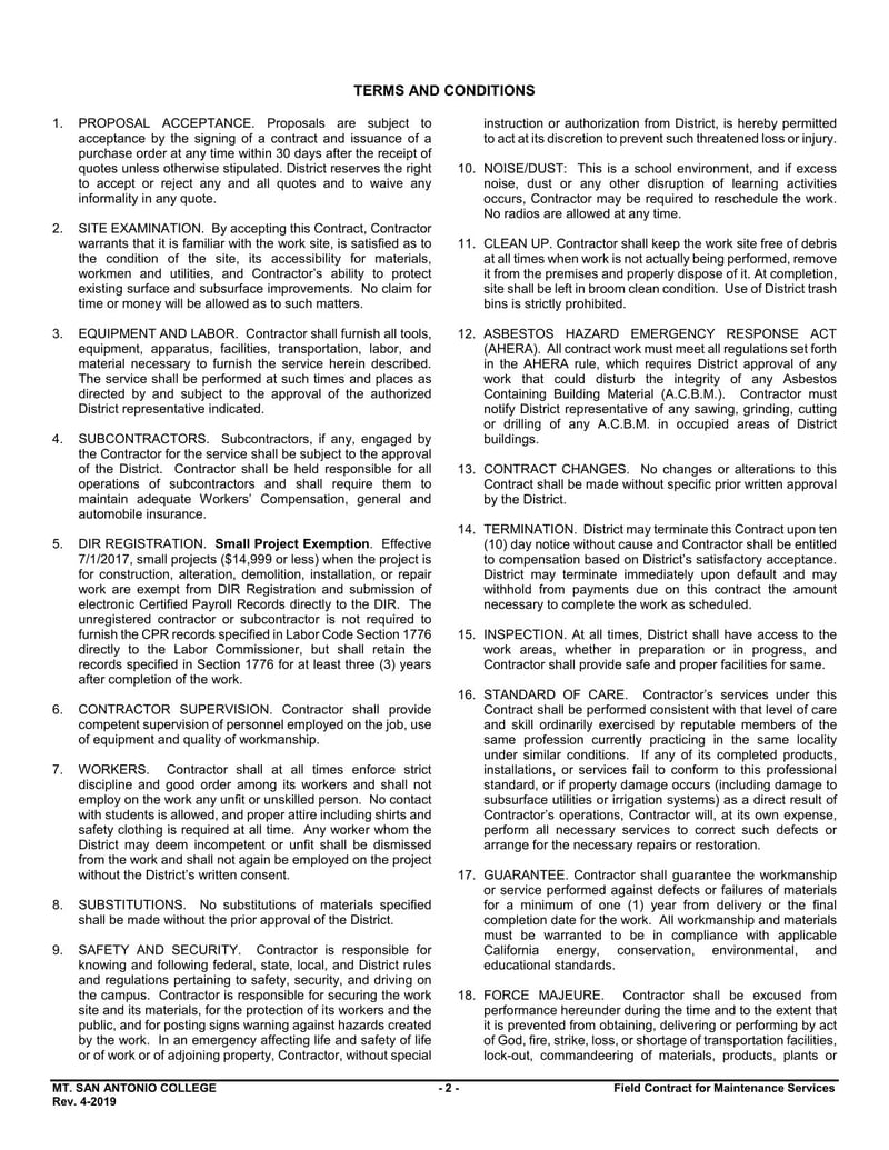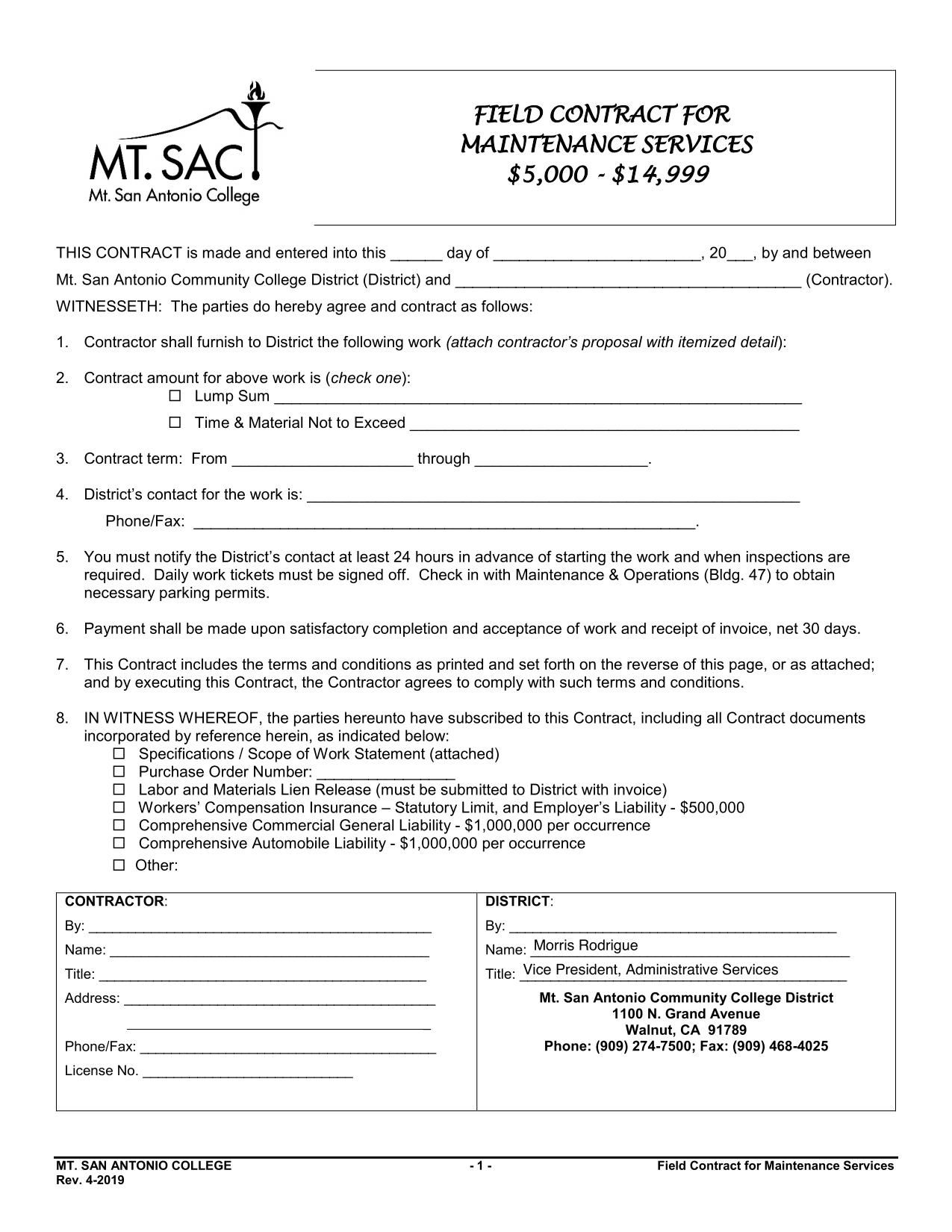 The Field Contract for Maintenance Services $5,000-$14,999 is an agreement between Mt. San Antonio Community College District and the contract outlines the obligations and responsibilities of both parties.