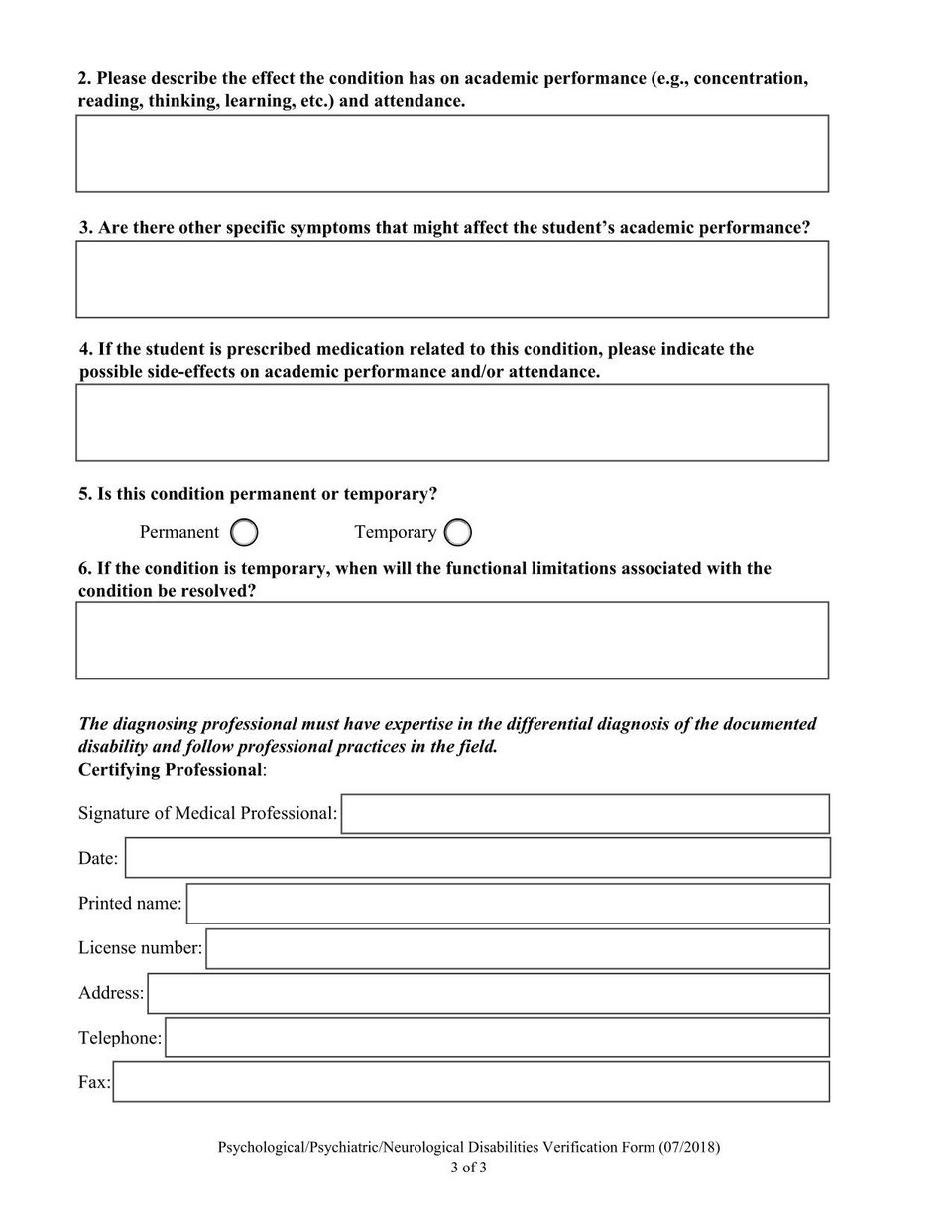 - Sonoma State University Psychological/Psychiatric/Neurological Disabilities Verification Form