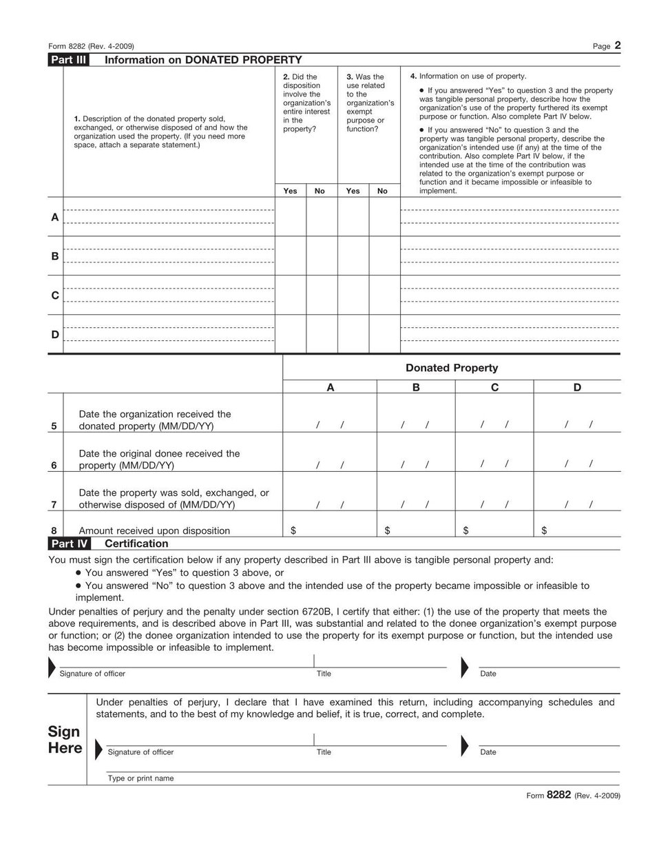 The Form 8282 is used by charitable organizations to report the sale, exchange or other disposition of donated property.