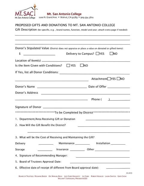 The form is used by individuals or organizations to propose a gift donation to MTSAC.