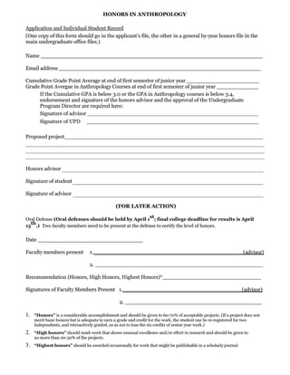 This Rutgers University Honors in Anthropology form is for eligible students applying for the Honors in Anthropology program at Rutgers University. Students need to fill in their personal information, academic records and provide a written statement of interest.