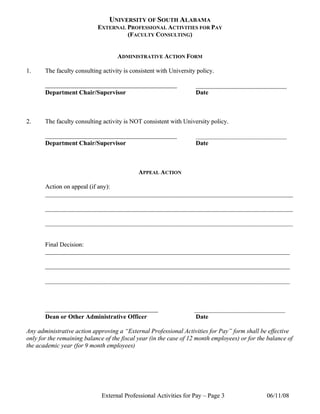 The University of South Alabama External Professional Activities for Pay Form is used by faculty members to request engagement in external professional activities for pay.