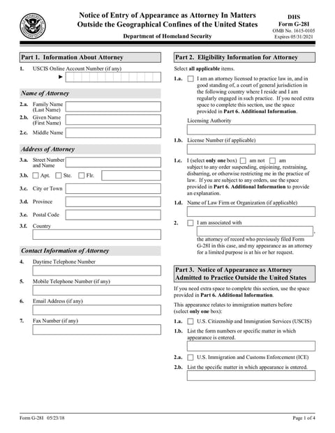 Notice of Entry of Appearance as Attorney In Matters Outside the Geographical Confines of the United States is used by an attorney or accredited representative who is not an employee of the Department of Justice (DOJ) and who wishes to represent an applicant before an immigration judge or the Board of Immigration Appeals (BIA) in a proceeding that is not subject to the jurisdiction of the Executive Office for Immigration Review (EOIR).
