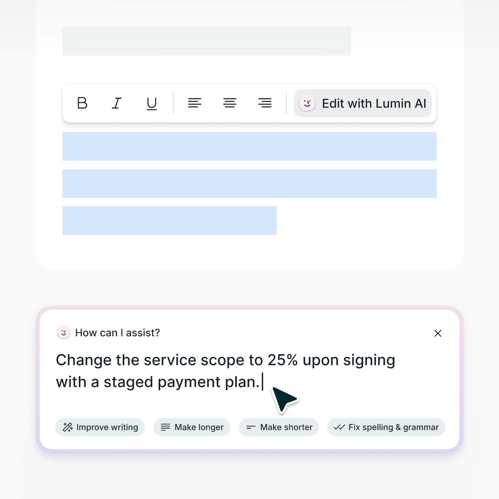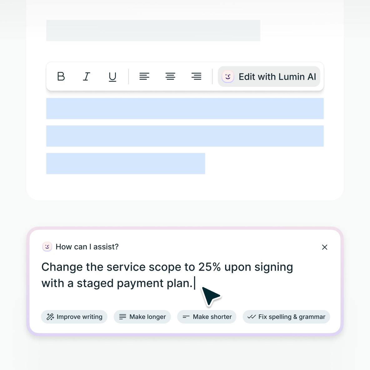 Just tell our AI assistant what changes you need and it will update your contract immediately. Once you’re happy with the document you can export it or send it on to clients or other third parties to sign with Lumin Sign.Generating your agreement is simple. Just type in the type of document you want to create in the prompt bar and AgreementGen will build a draft in seconds.